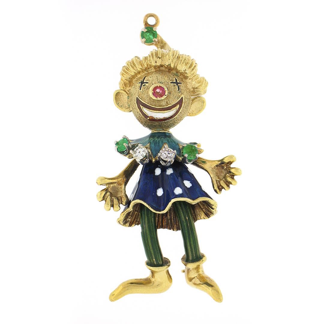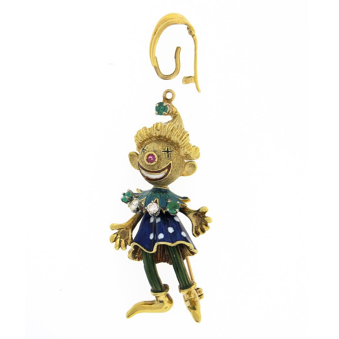 A solid 18k yellow gold and enamel workl brooch pendant, with 1 round brilliant cut natrual ruby (0.06ctw), 2 round brilliant cut natural diamonds (G/H - VS1/VS2 ; 0.14ctw), and 3 round brilliant cut natural emeralds ( 0.24ctw). Measures 64.3x24.9mm and weighs a total of 18.05 grams.