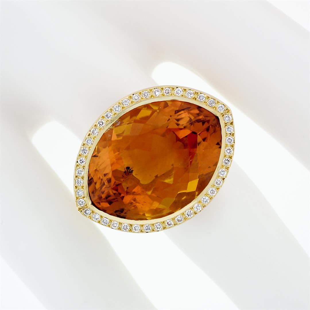 A solid 18k yellow gold almond eye shaped ring, with 1 wide fat marquise cut natural citrine (20x14.5mm), surrounded with a halo of 82 round brillaint cut natural diamonds (F/G - VS1/VS2; 0.60ctw). The ring is size 6.0, weighs a total of 13 grams, and measures 18.7mm wide.