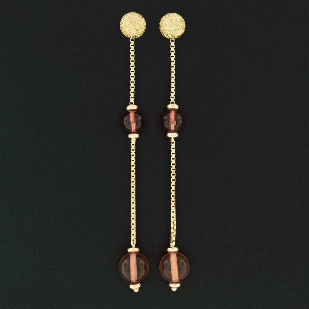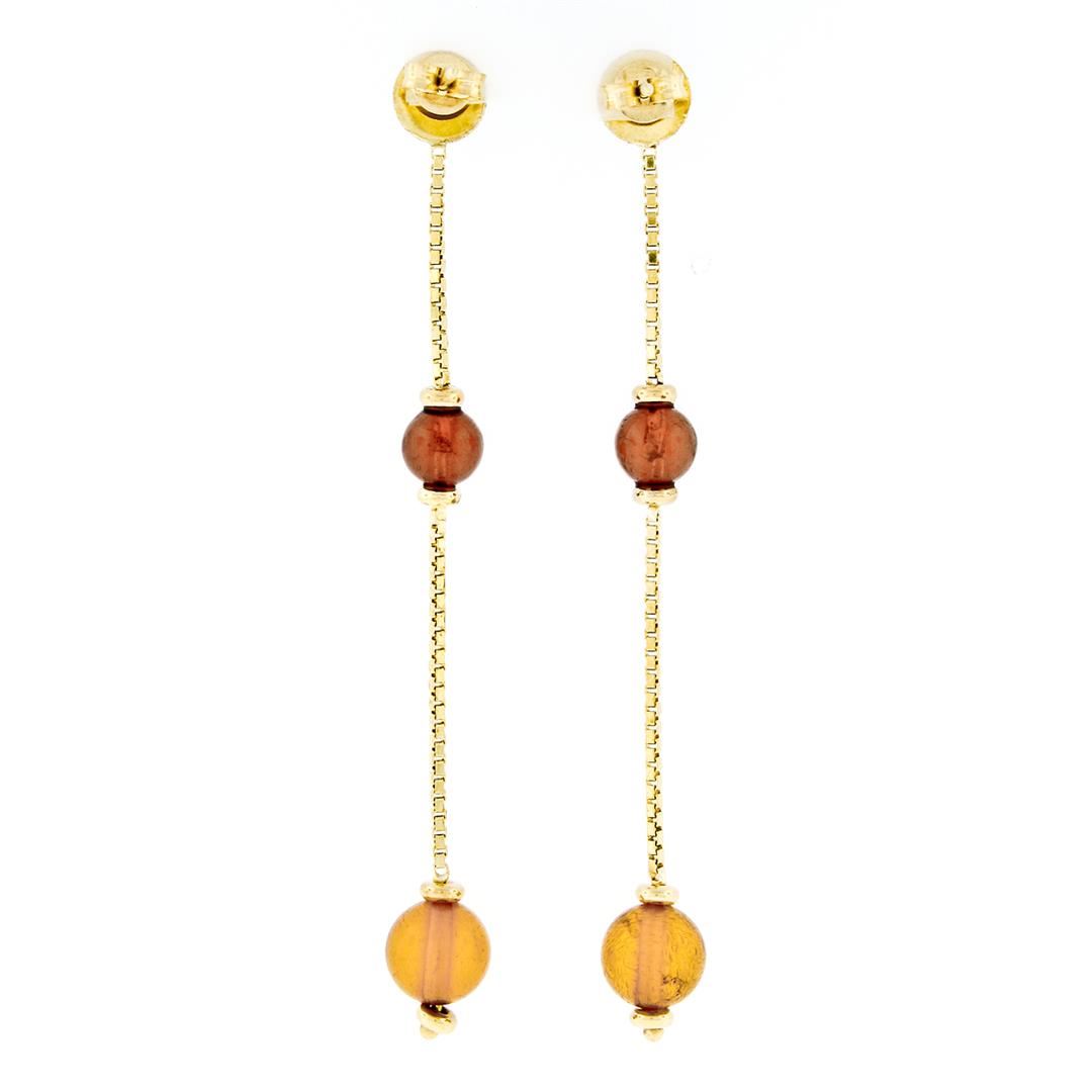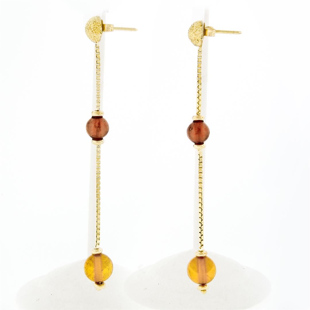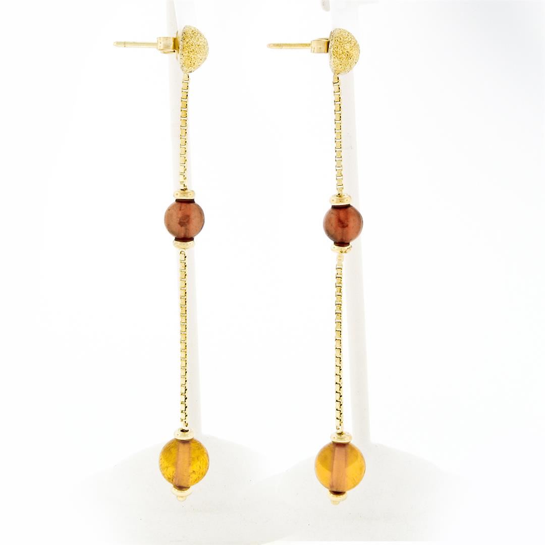 An estate solid 18k yellow gold dangle drop earrings, with 4 round bead shape natural cetrines (6.20 - 8.20mm). The earrings measure approximately 75.75x7.10mm and weigh a total of 4.71 grams.