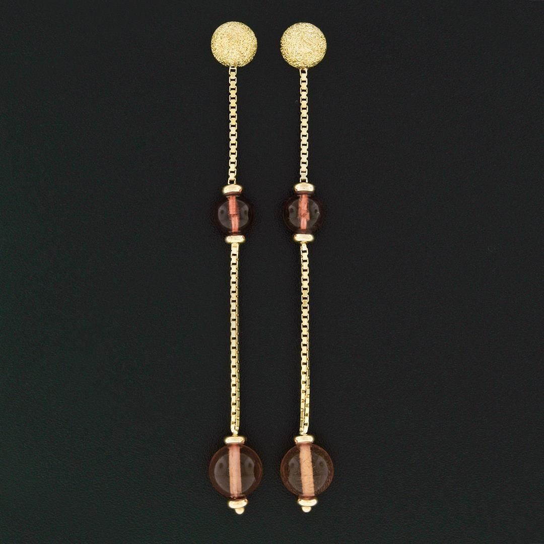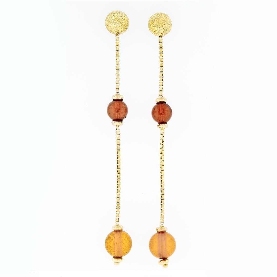 An estate solid 18k yellow gold dangle drop earrings, with 4 round bead shape natural cetrines (6.20 - 8.20mm). The earrings measure approximately 75.75x7.10mm and weigh a total of 4.71 grams.