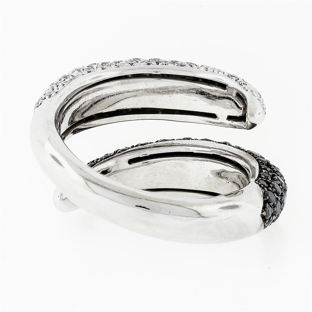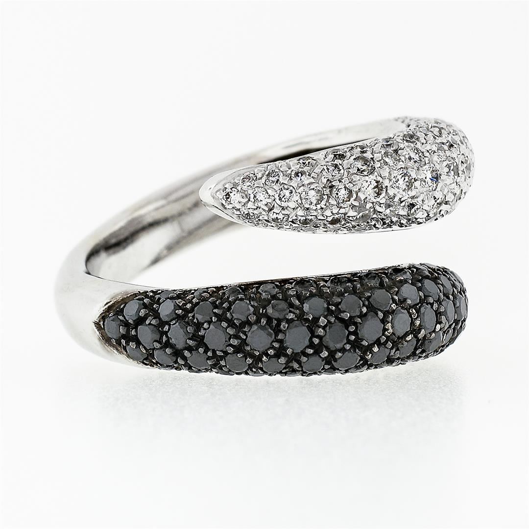 A solid 18k white gold wrap band ring, with 88 round brilliant cut natural diamonds (F - VS2/SI1 ; 0.90ctw). and 88 round brilliant cut natural diamonds (Fancy Black Color ; 0.90ctw). The ring is size 9.0, weighs a total of 12.71 grams, and measures 14.2mm wide.