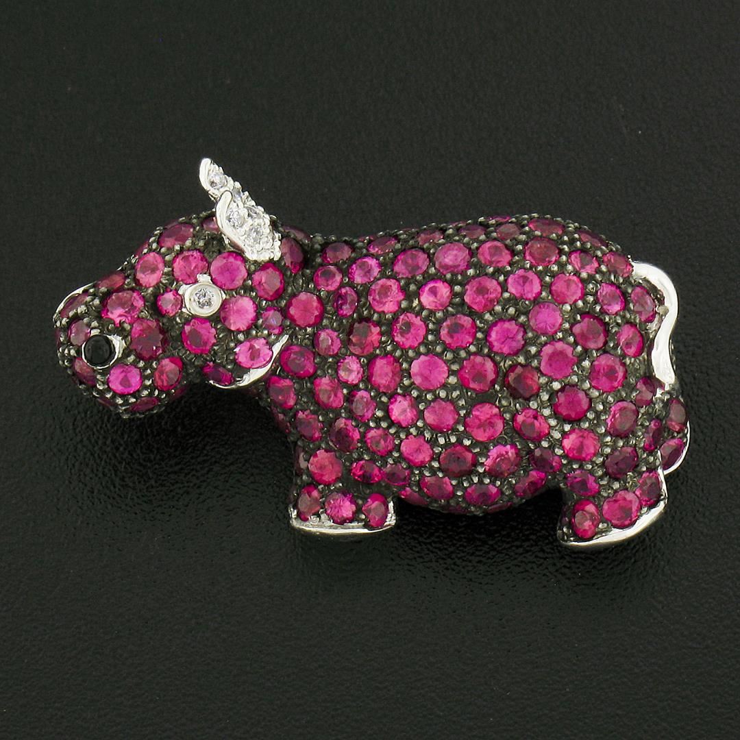 A solid 18k white gold hippo brooch pendant, with numerous of round brilliant cut natural rubies (4.0ctw), 9 round brilliant cut natural diamonds (G/H - VS2-SI2 ; 0.09ctw), and 1 round cabochon cut natrual black onyx (1.5mm). Measures 19.5x31.6mm and weighs a total of 8.52 grams.