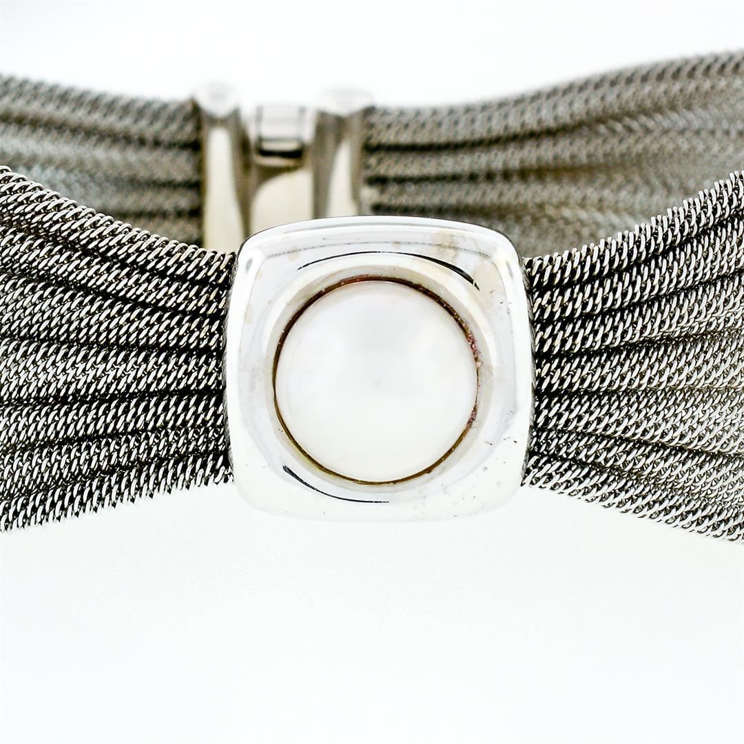A solid 18k white gold scrunched mesh bracelet with 1 round top mabe pearl (10mm). It weighs a total of 30.97 grams, measures 26mm wide, and measures 6.5 inches in length.