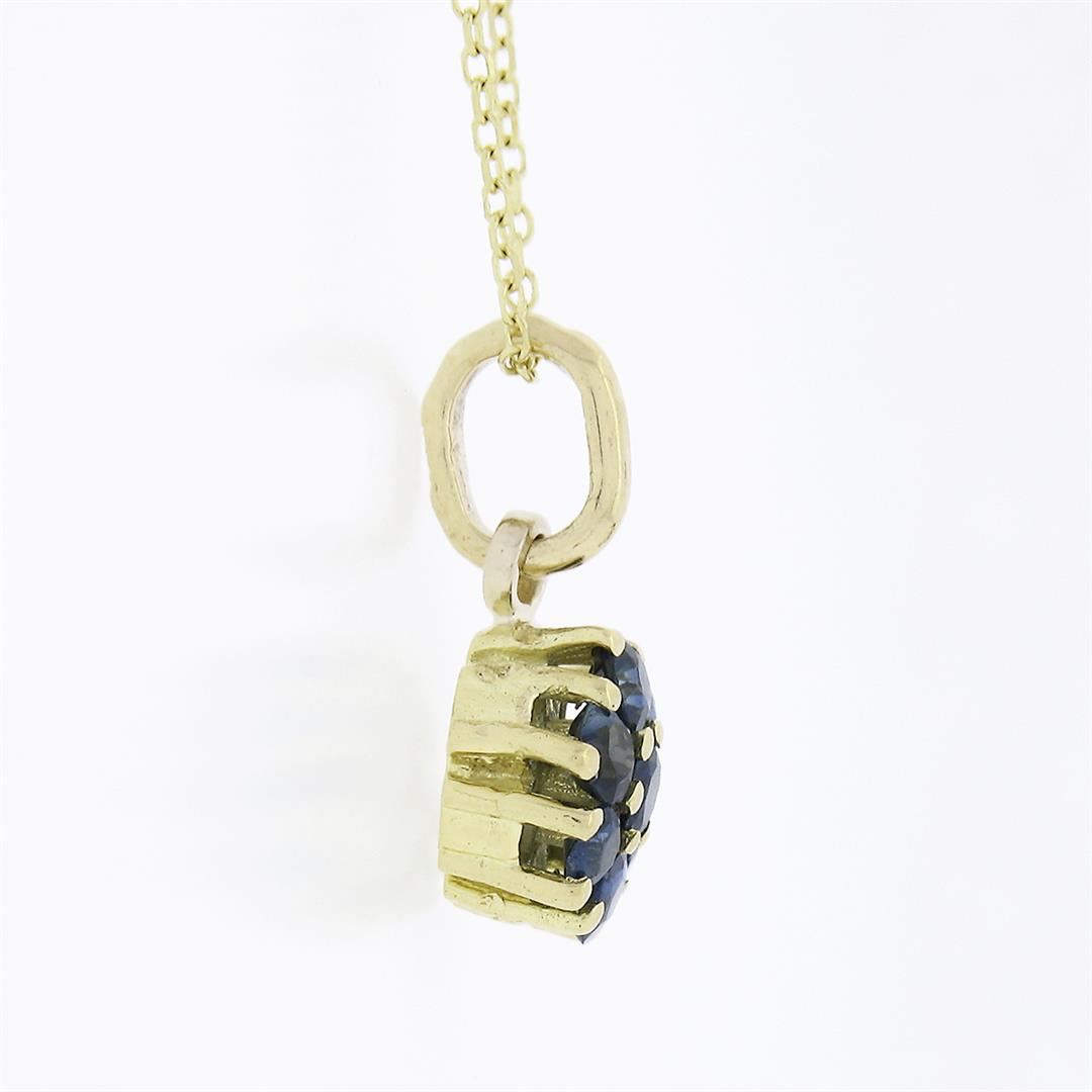 A solid 18k yellow gold flower pendant necklace, featuring 7 round brilliant cut natural sapphires (0.70ctw). 16 inch cable link chain, 2.42 grams total weight, pendant measures 7.9mm in diameter.