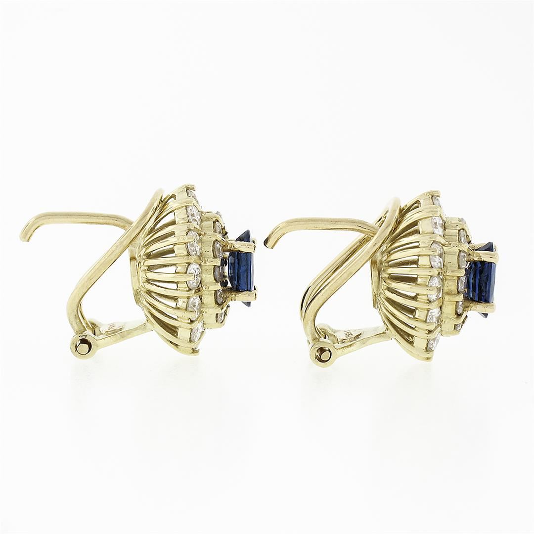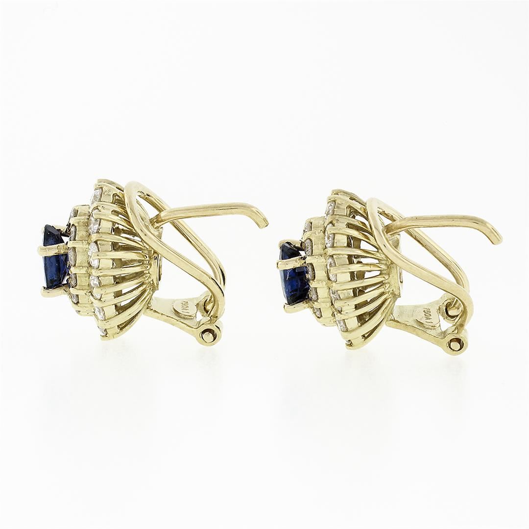 An estate solid 18k yellow gold tiered halo earrings, with 2 oval shape natural sapphires (6.05x4.23mm - 1.30ctw ), and 48 round brilliant cut natural diamonds (F/G - VS1/VS2 ; 1.40ctw). The earrings measure approximately 13.6x11.5mm and weigh a total of 6.41 grams.