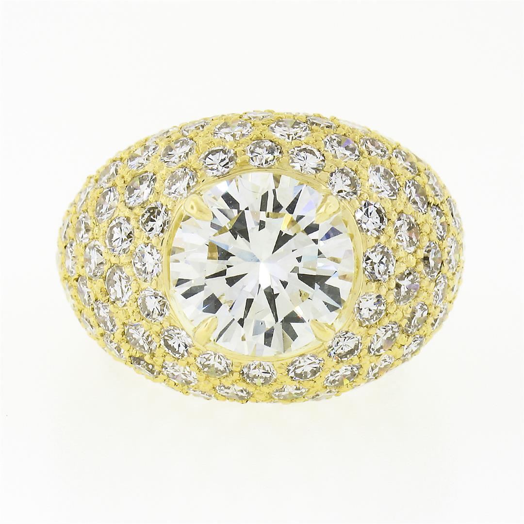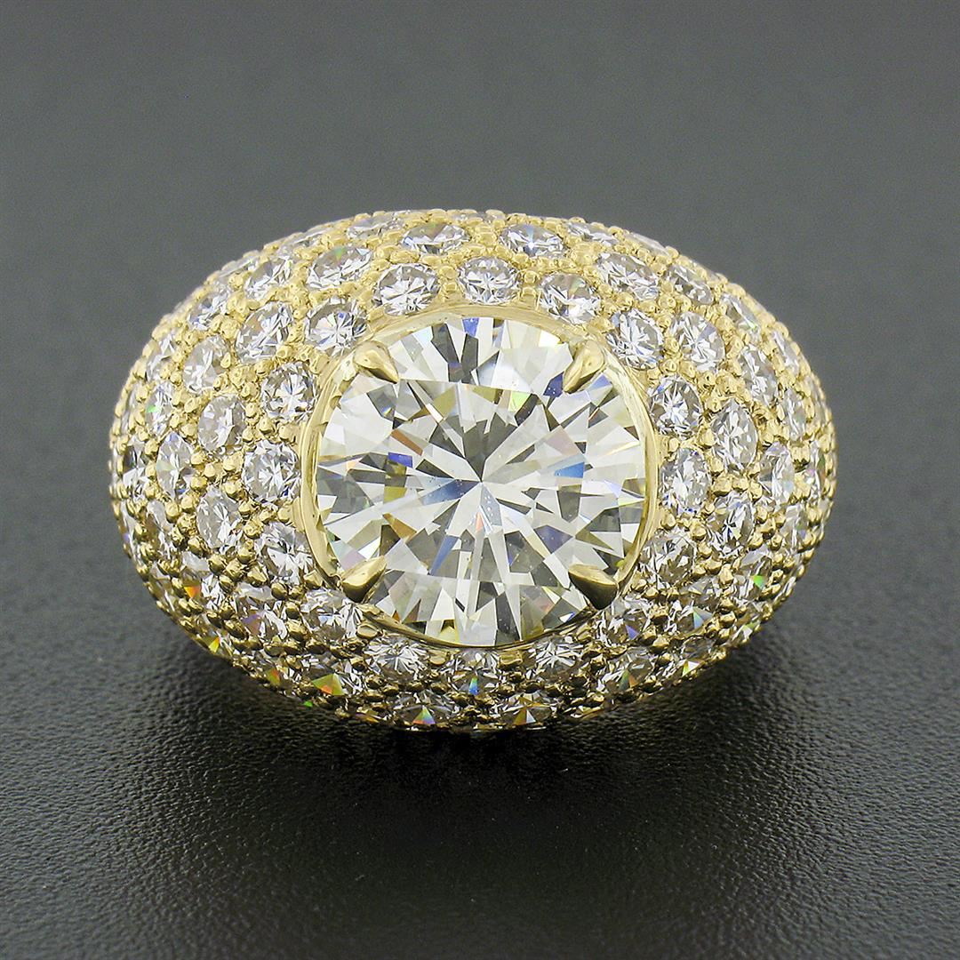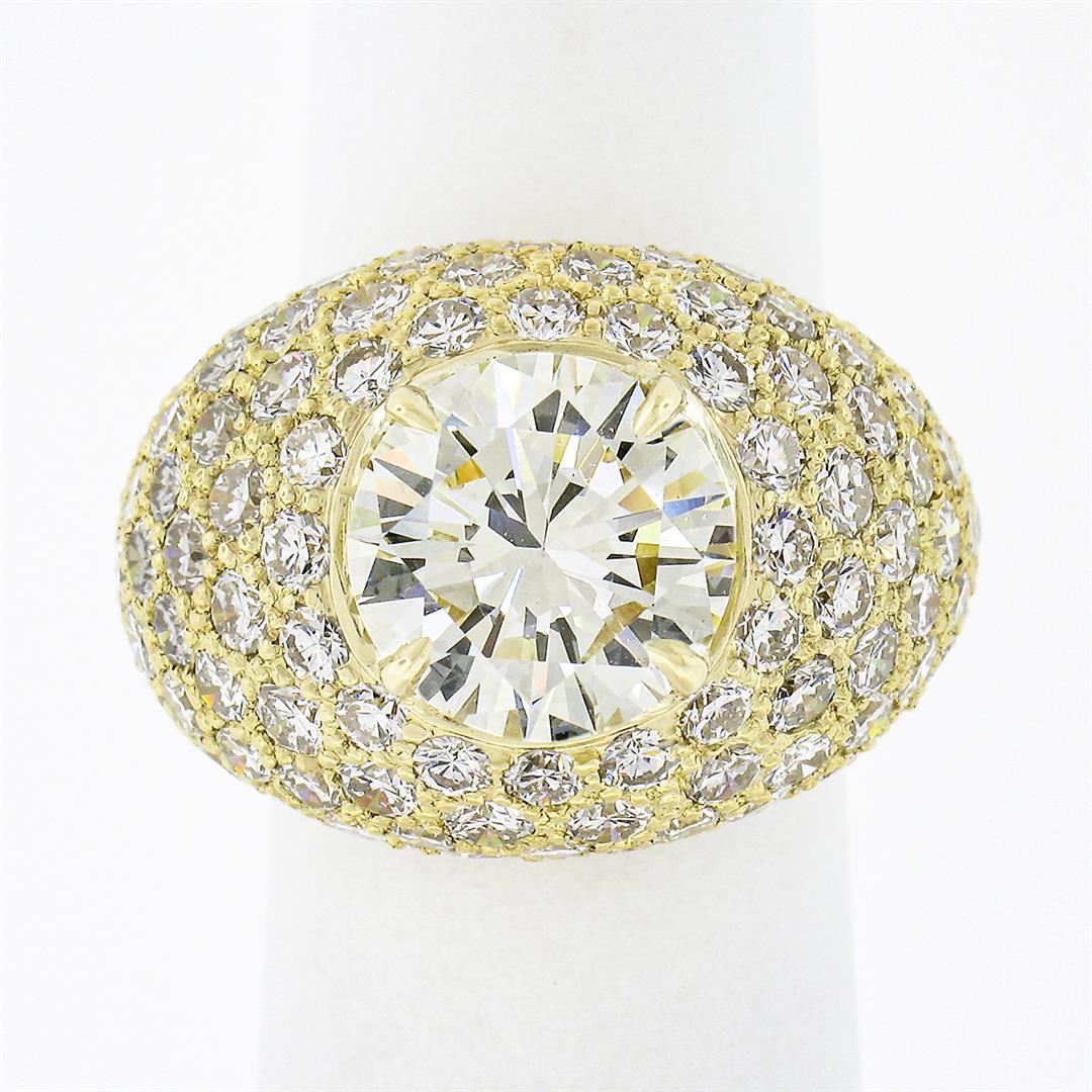 A solid 18k yellow gold band ring, with 1 Gia certified round brilliant cut natural diamond (N - VVS2 ; 3.55ct), and 120 round brilliant cut natural diamonds (E/F - VVS2/VS1 ; 4.40ctw). The ring is size 5.5, weighs a total of 10.56 grams, and measures 16.