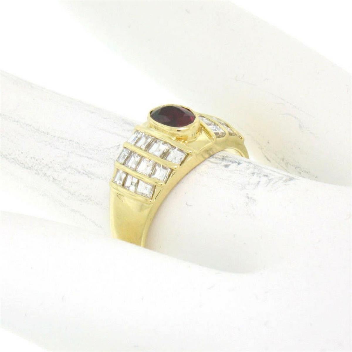 An 18kt yellow gold wide band ring featuring a 0.75ct bezel set oval ruby accented by 1.00ctw of Asscher cut diamonds (D/E - VVS2). The ring is size 6.0, weighs a total of 5.80 grams, and measures 9.15mm wide.