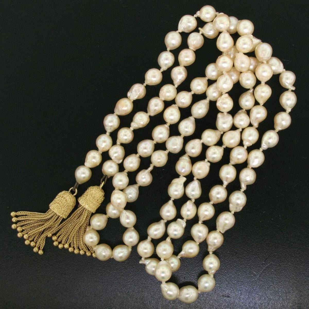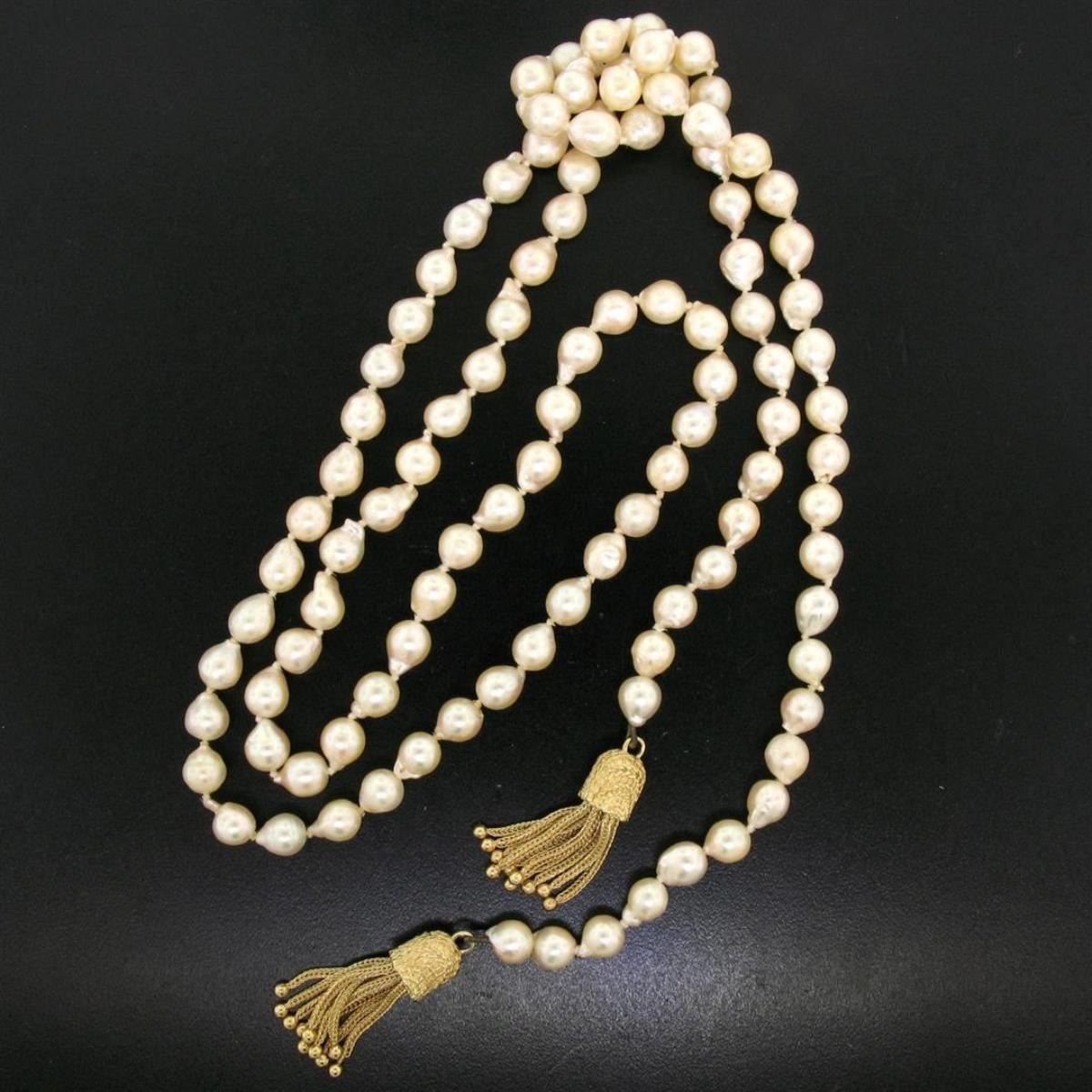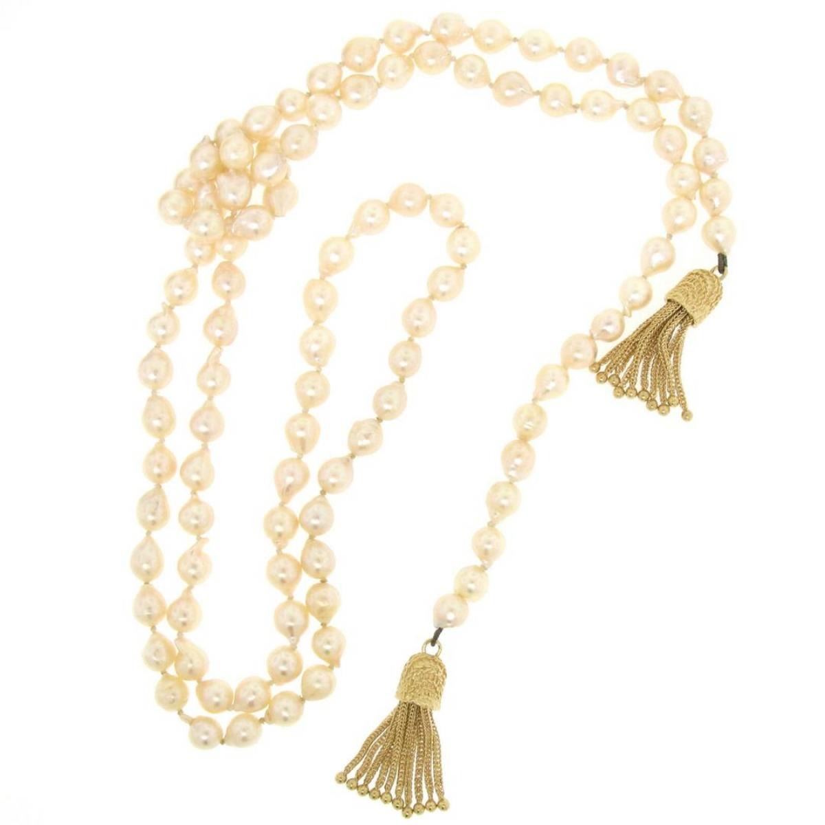 One Estate 38" Long 6.5-7mm Natural Pearl Strand Lariat Necklace w/ Dual 14K Tassels. Item Details: Material: 14K Solid Yellow Gold, Weight: 54.15 Grams, Stone(s): (103) Natural Genuine Pearls - Natural Baroque Shape - Ivory Color w/ Pink Overtones - Magnificent Luster - 6.5 to 7.0mm (approx.), Chain Length: 38 Inches, Tassel Width: 8.55mm, Tassel Height: 29.62mm, Condition: Estate piece. Well cared-for, like new condition!,
