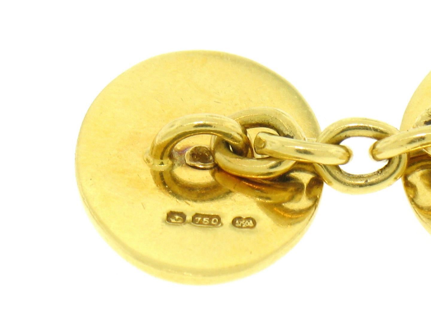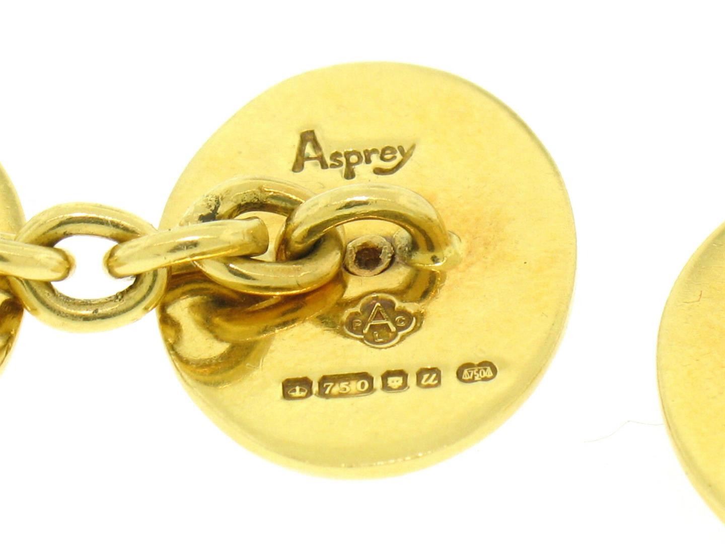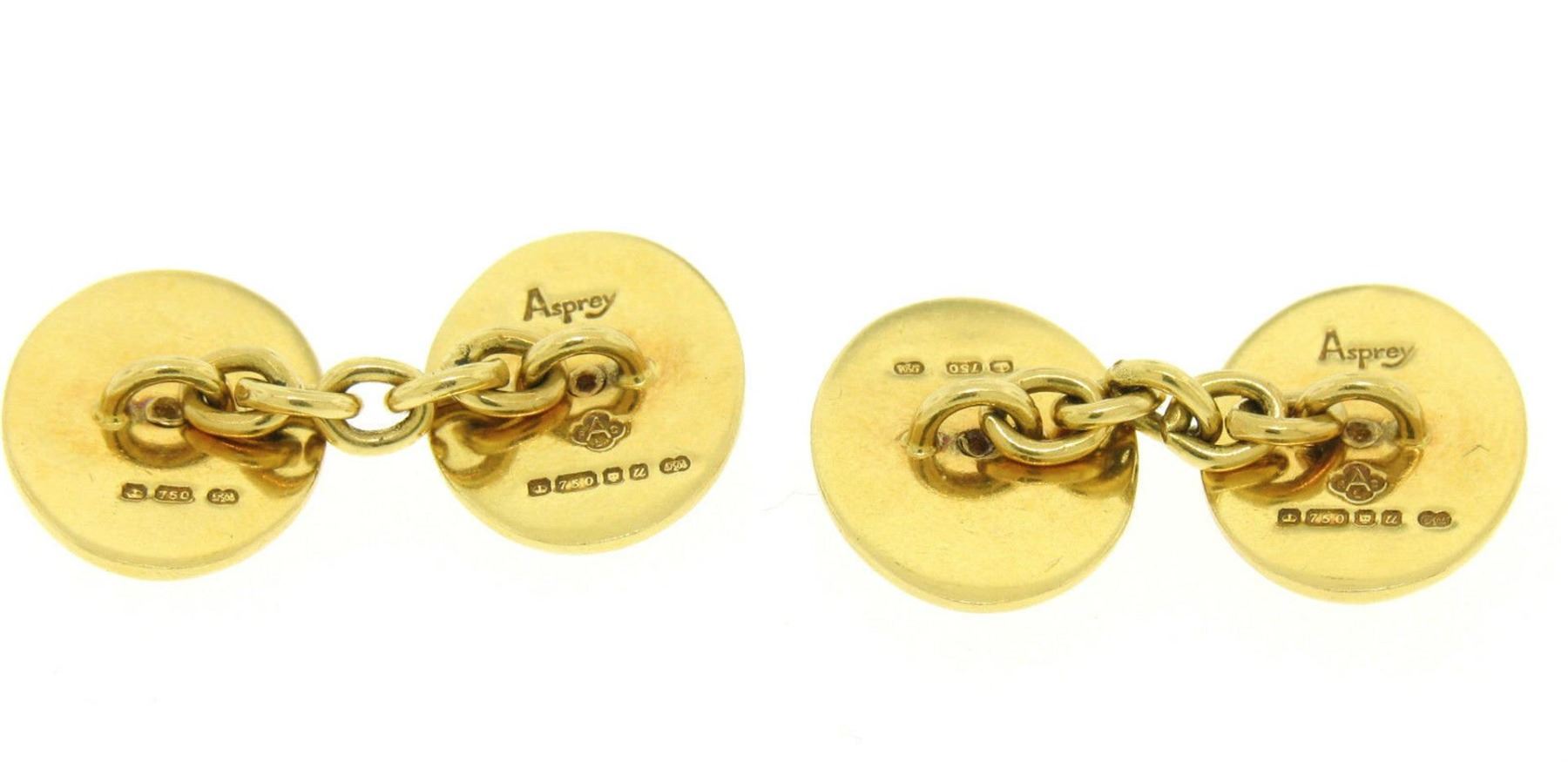 A 100% original pair of solid 18k yellow gold cuff links by Asprey featuring red and white enamel stripes with 5-pointed stars at the center of each panel.These cuff links have a chain linked dual panel design, weigh a total of 17.20 grams, and the panels measure 18.9x14.0mm.
