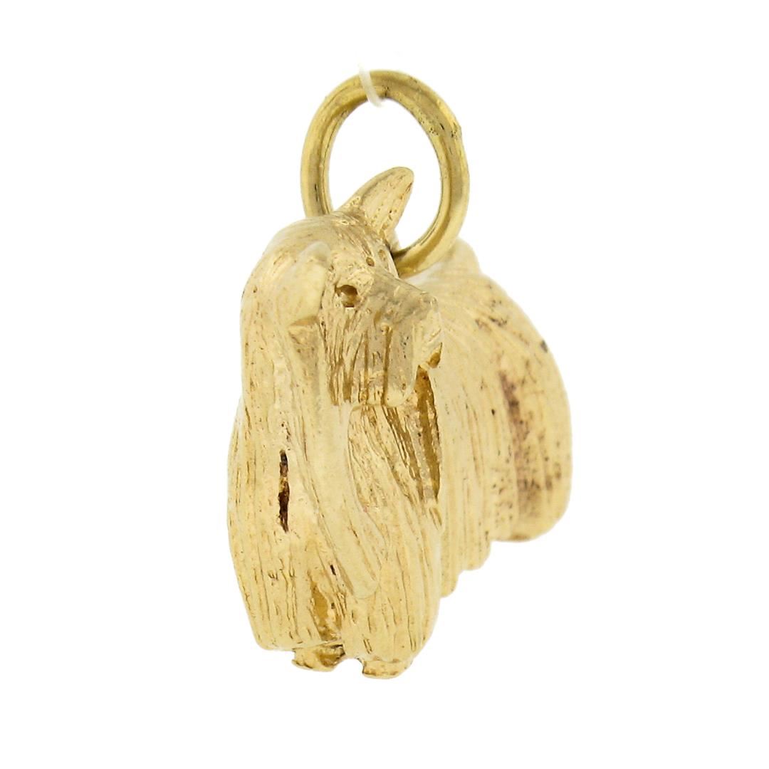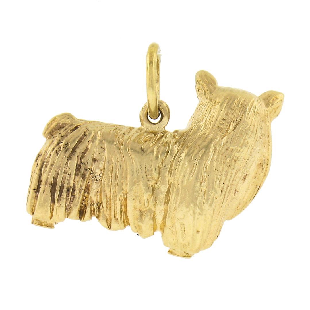 A solid 14k yellow gold terrier charm pendant. The pendant weighs a total of 5.59 grams, measures 16x18.1mm including the bail, and the inside of the bail measures 3.5x3.3mm.
