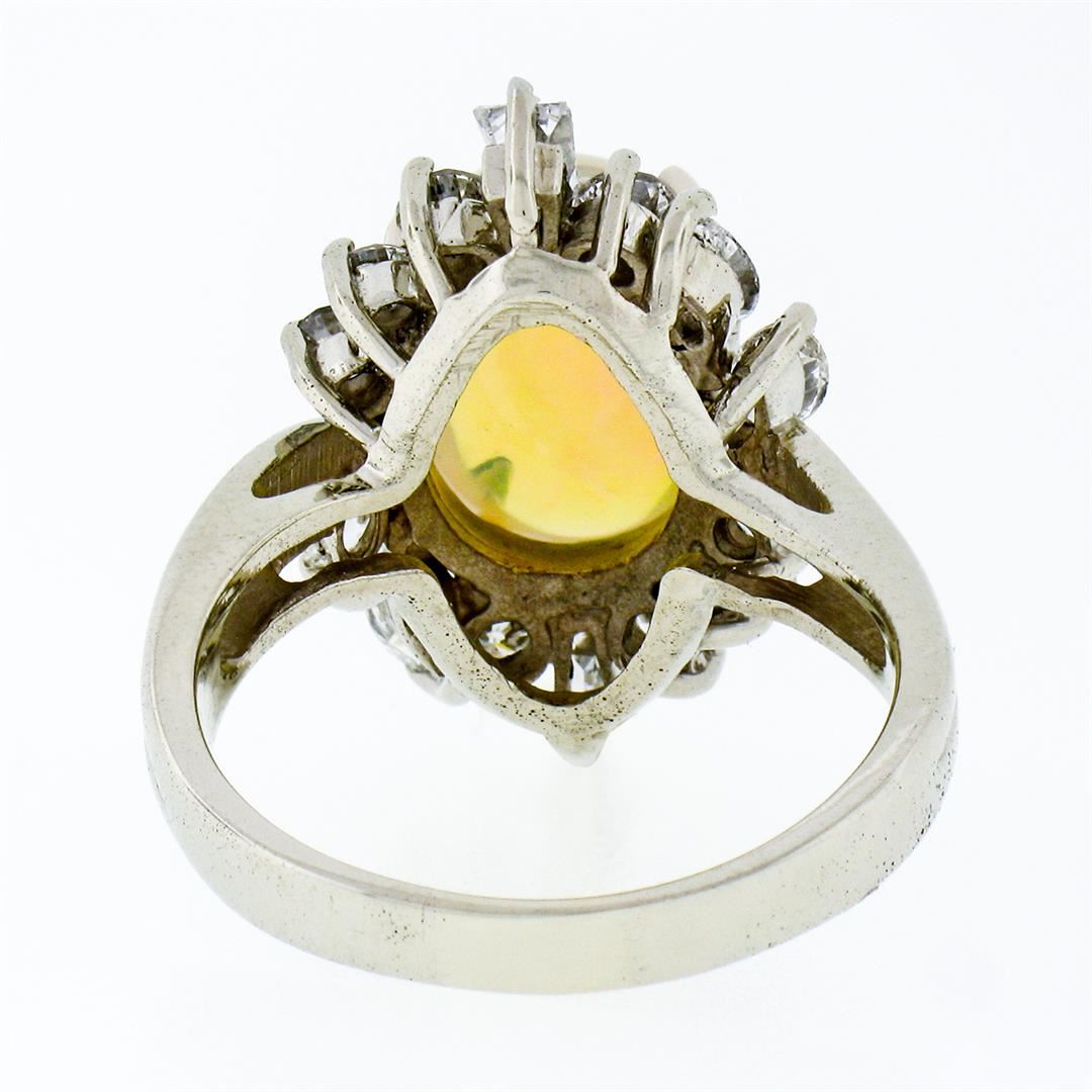 A solid 14k white gold cocktail ring, with 1 oval cabochon cut natural opal (12x9.10mm - 2.71ct), surrounded with 14 marquise, round & baguette cut natural diamonds (F/G - VVS2/VS2 ; 1.16ctw). The ring is size 9.75, weighs a total of 6.19 grams, and measu