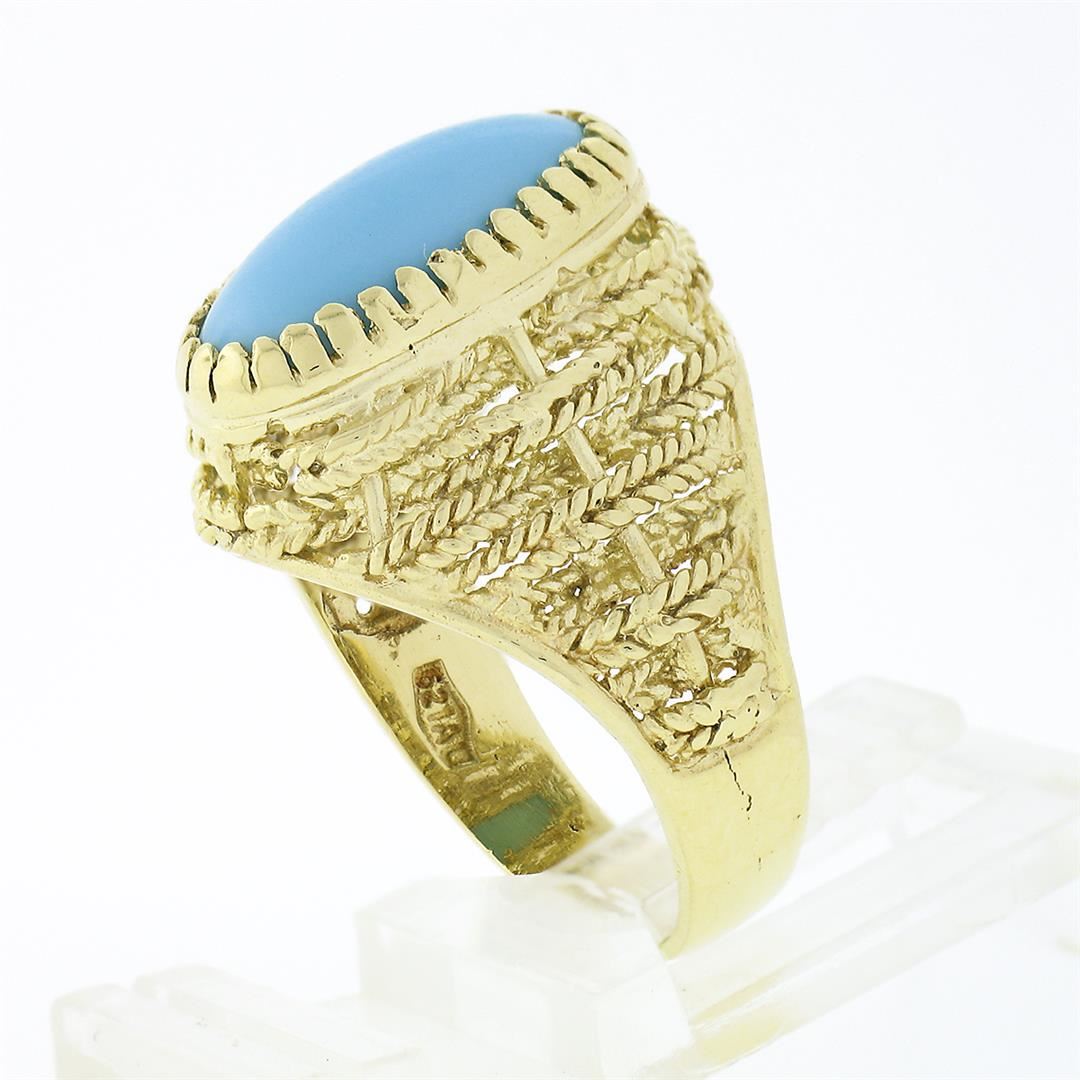 A solid 18k yellow gold italian solitaire braided cigar ring, with 1 elongated oval cabochon cut natural turquoise (14.6x7mm). The ring is size 7.5, weighs a total of 7.48 grams, and measures 17.95mm wide.