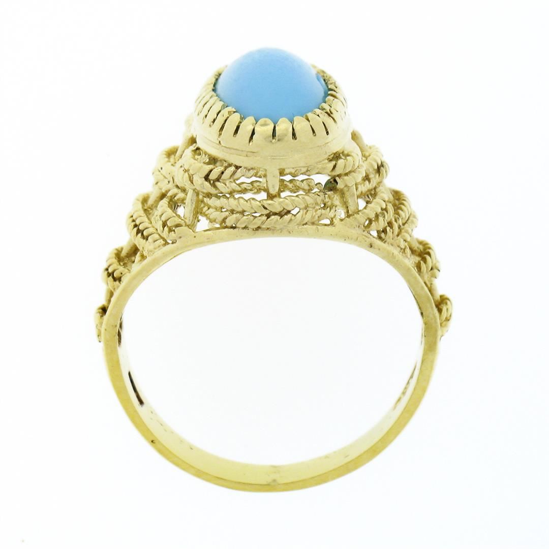 A solid 18k yellow gold italian solitaire braided cigar ring, with 1 elongated oval cabochon cut natural turquoise (14.6x7mm). The ring is size 7.5, weighs a total of 7.48 grams, and measures 17.95mm wide.