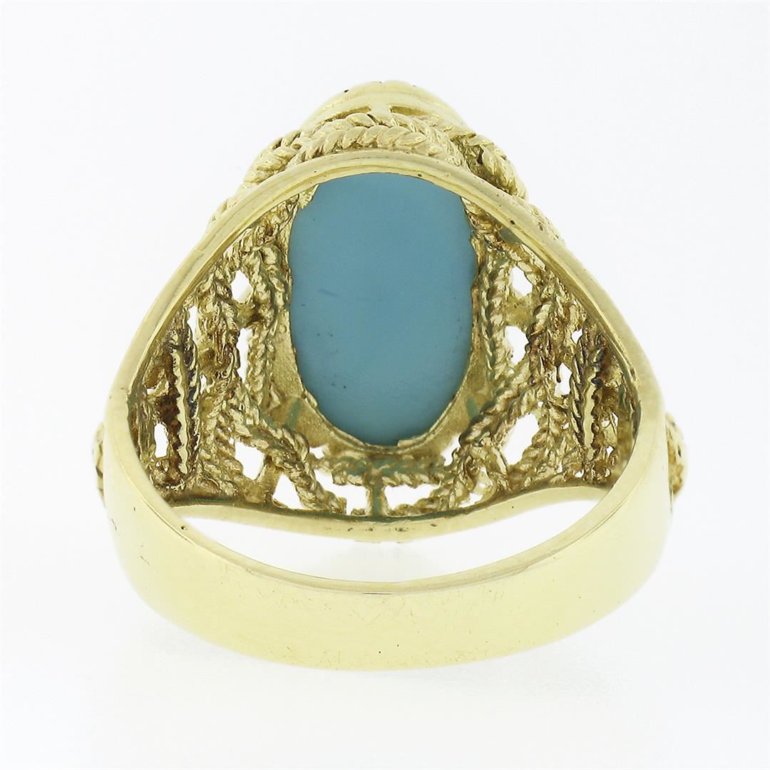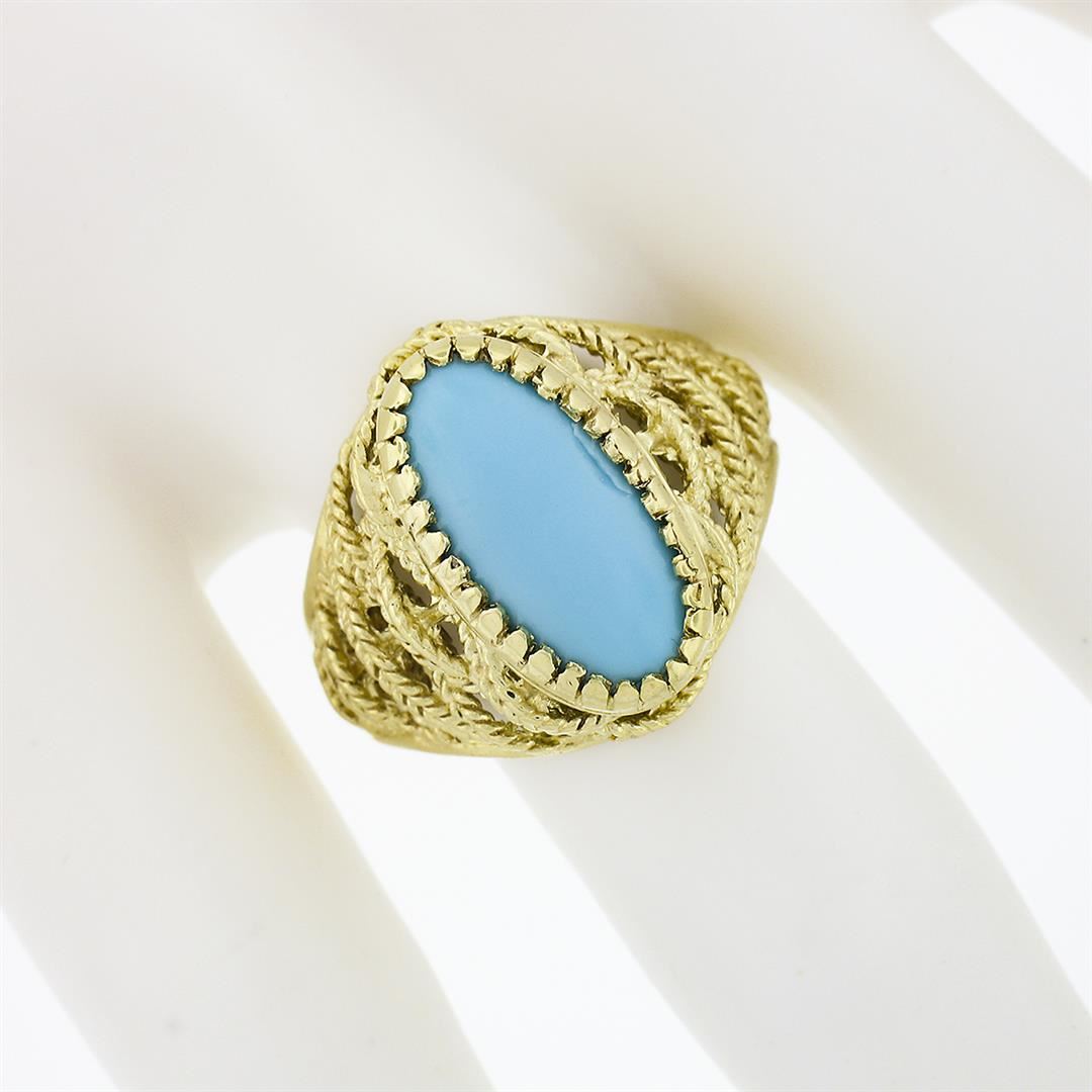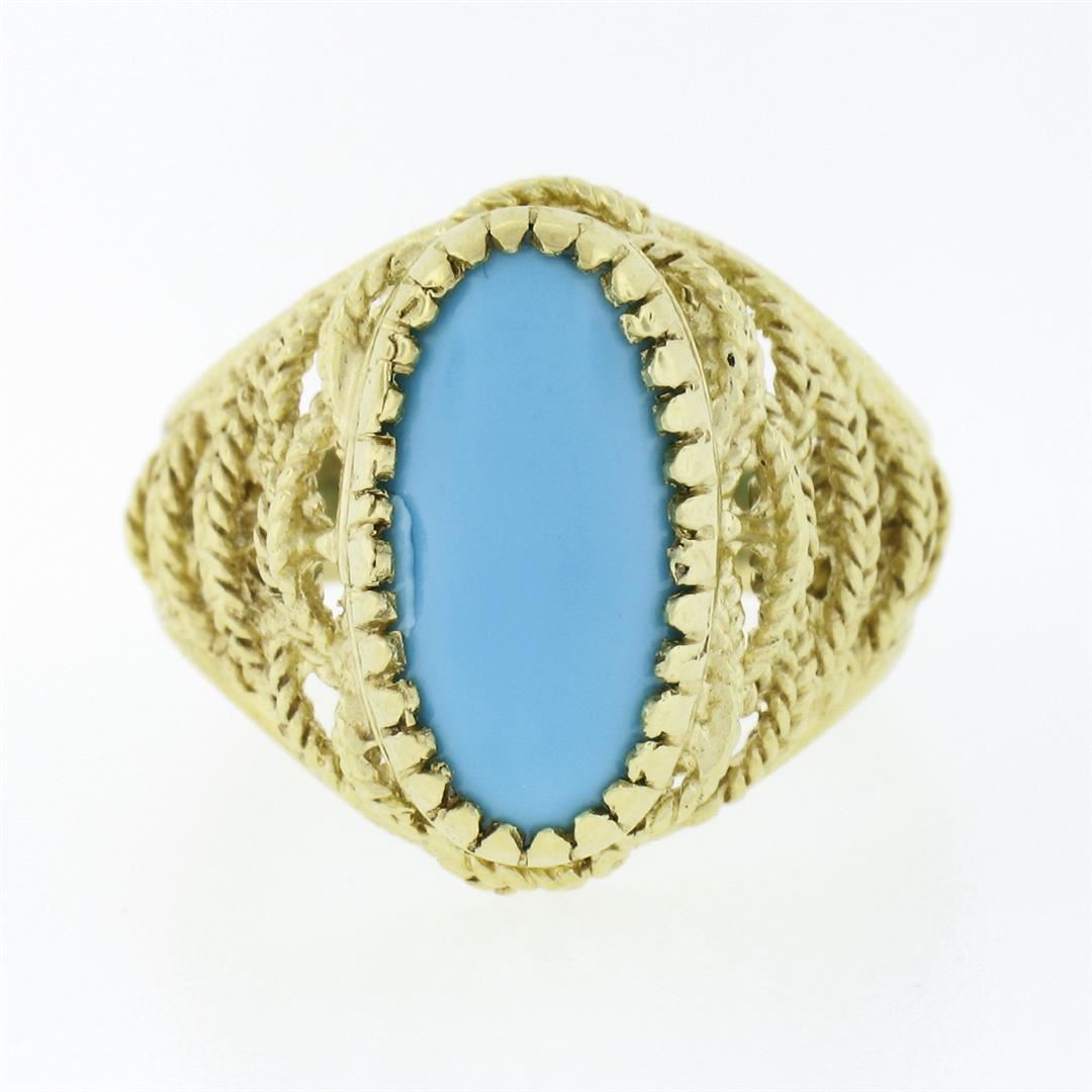 A solid 18k yellow gold italian solitaire braided cigar ring, with 1 elongated oval cabochon cut natural turquoise (14.6x7mm). The ring is size 7.5, weighs a total of 7.48 grams, and measures 17.95mm wide.