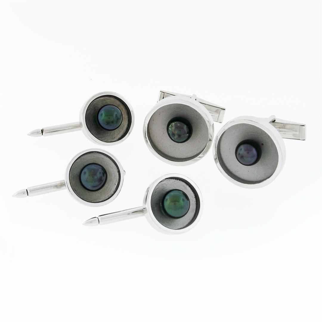 An estate solid 14k white gold round cufflink & 3 button stud set, with 5 round bead shape black natural pearls (6.2-6.7mm ). These cuff links have a swivel design with a clearance of 13mm, weigh a total of 26.44 grams, and the front panels measure 17mm in diameter, and the button studs measure in diameter 13.5mm.