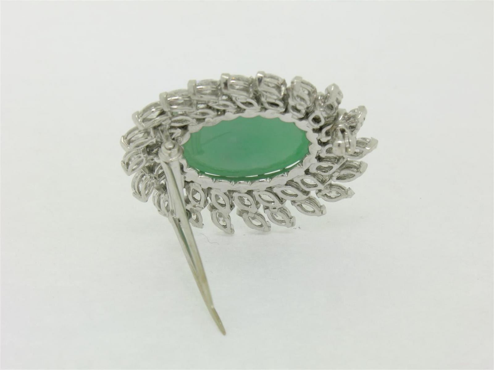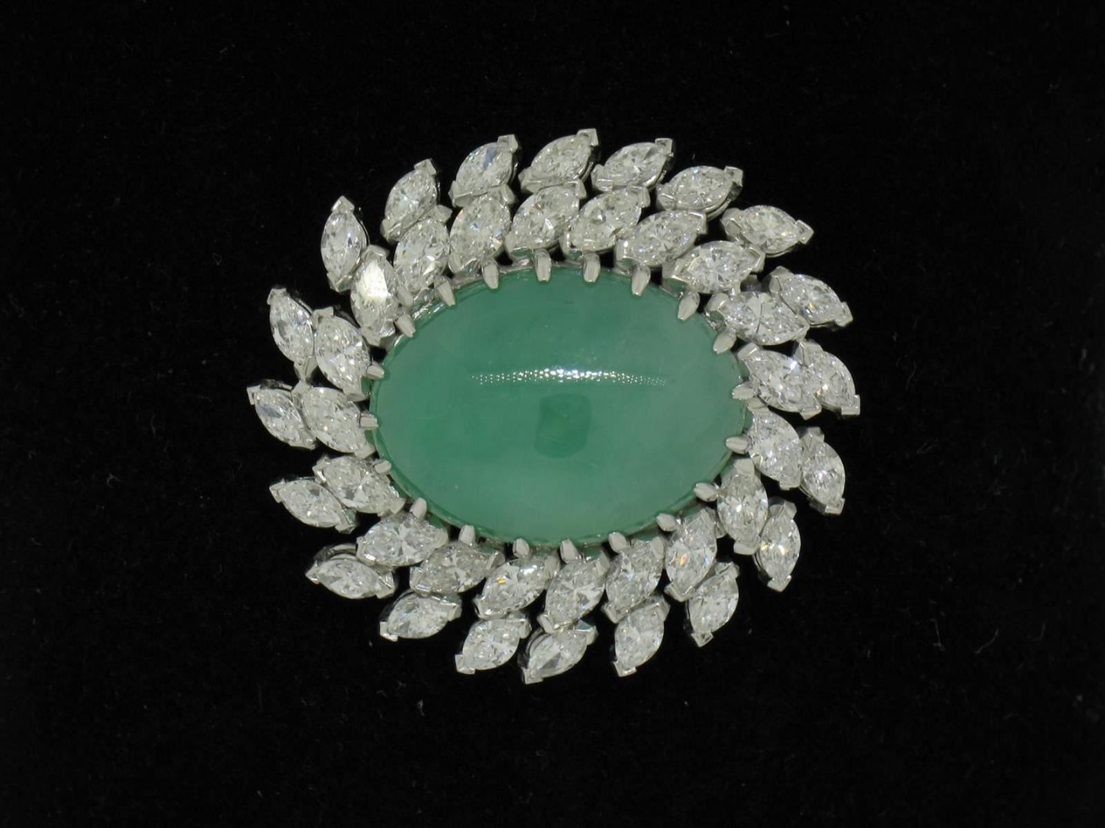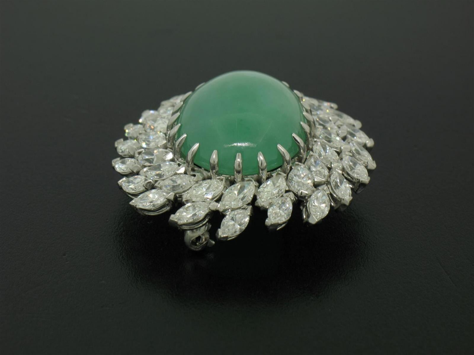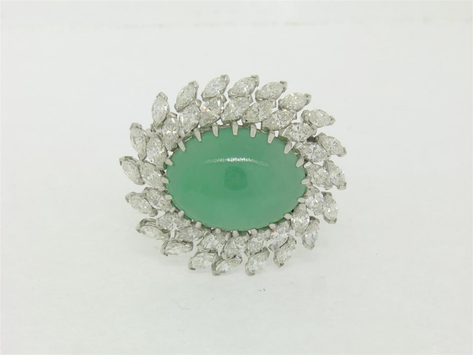 A vintage 900 platinum brooch featuring a large oval cabochon cut piece of natural jade (20.6x15.4mm; 16.45ct) surrounded by a dual swirling halo of 40 marquise cut natural diamonds (F to G - VS1/VS2; 6.00ctw). Measures 34.2x31.0mm and weighs a total of 24.13 grams.