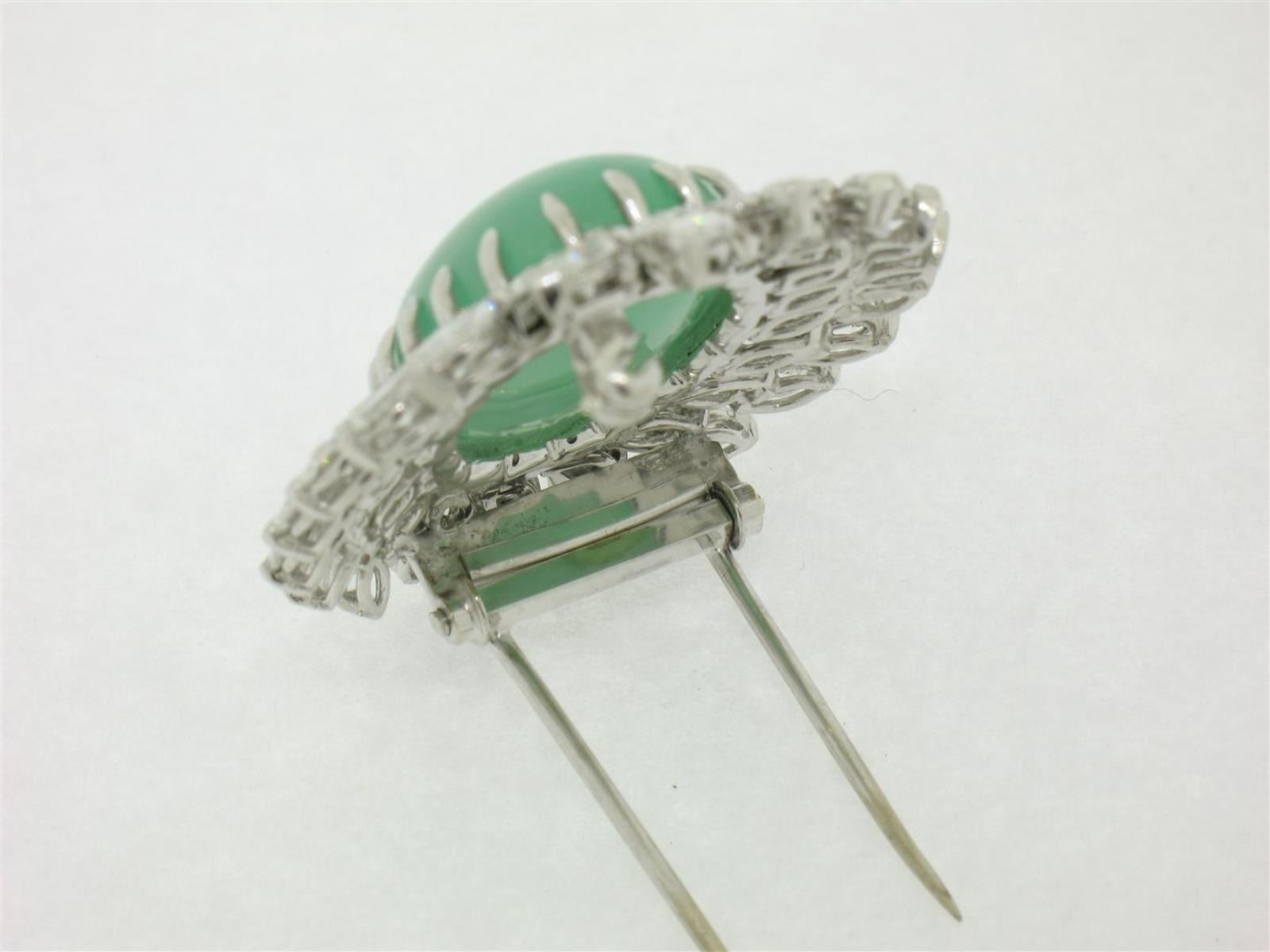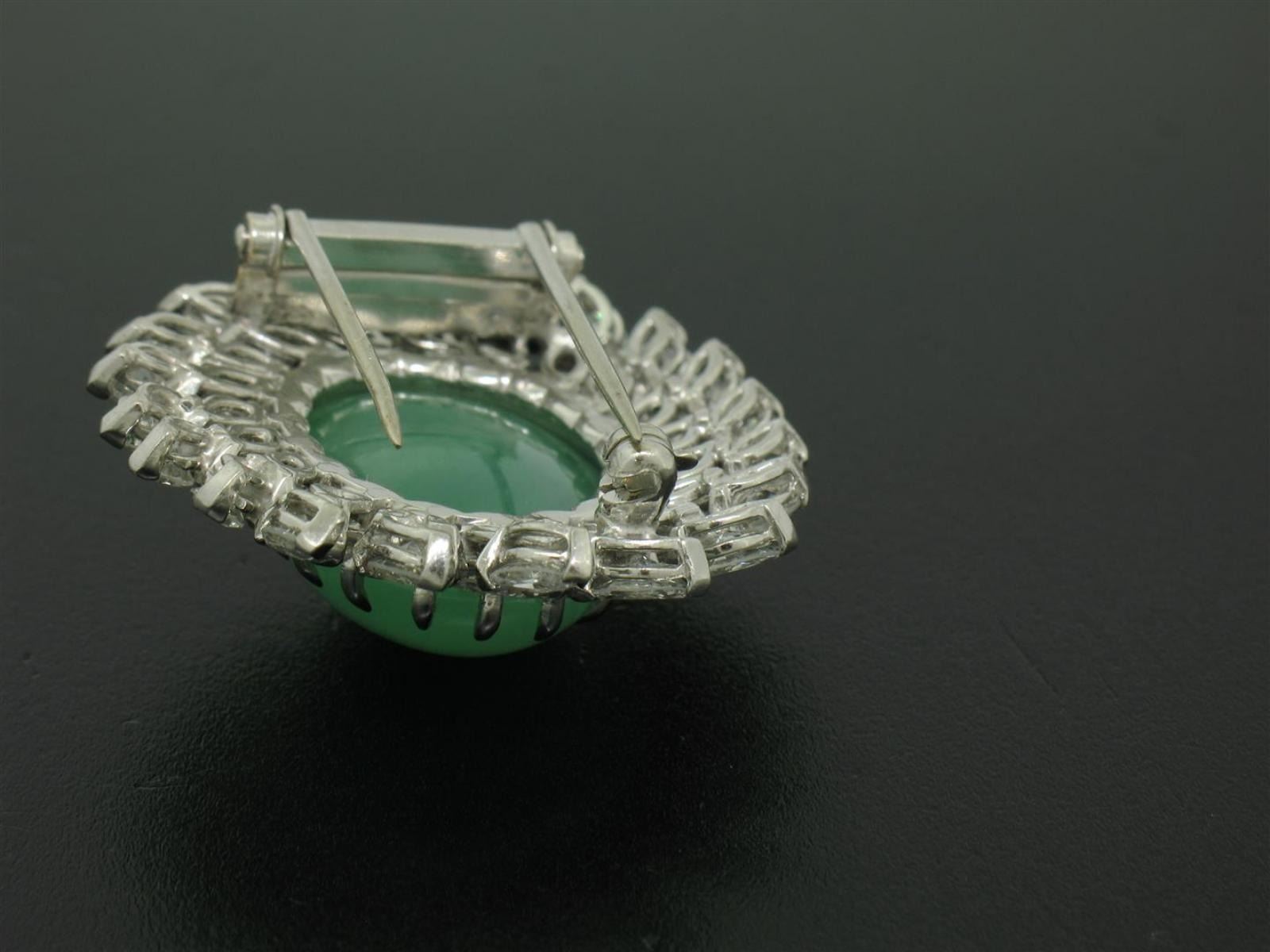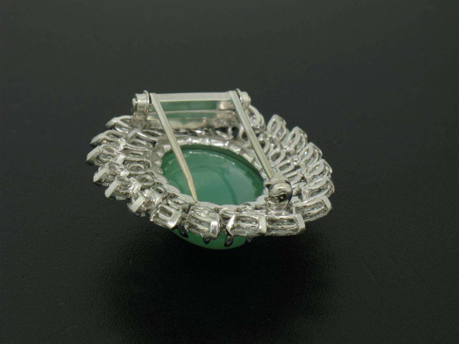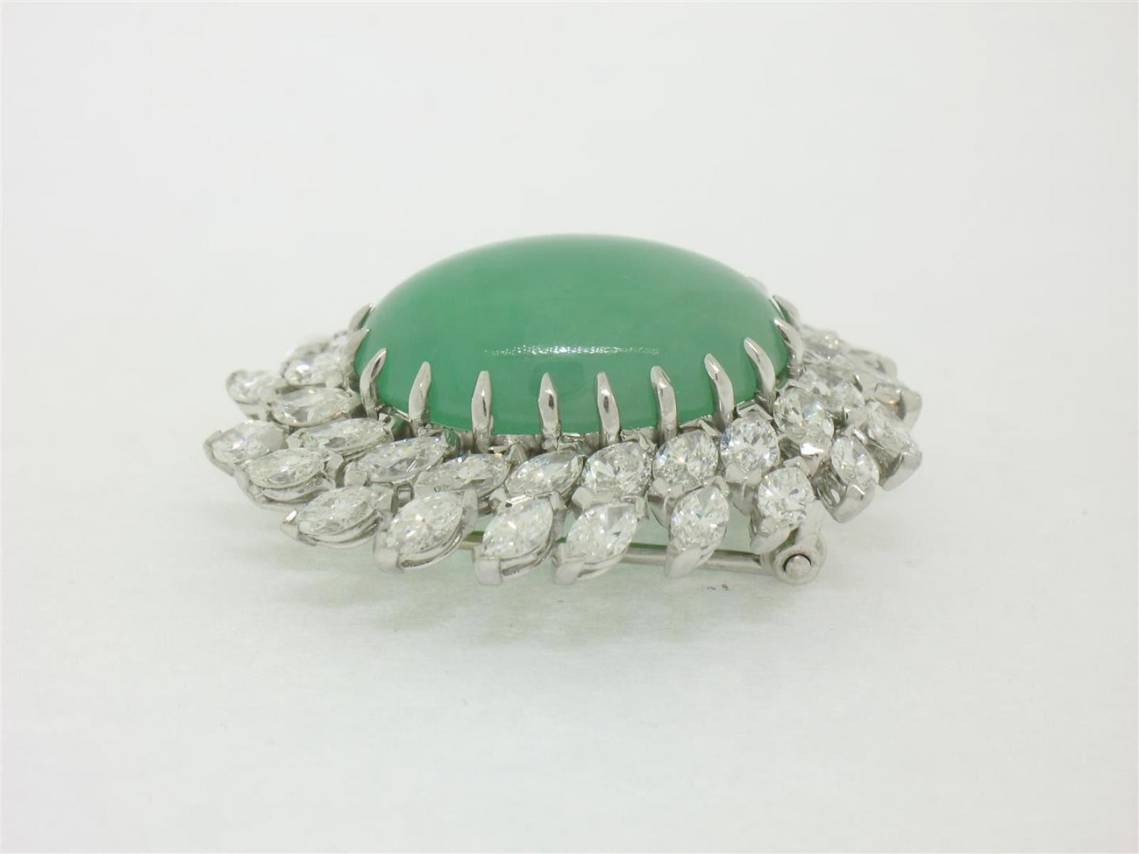 A vintage 900 platinum brooch featuring a large oval cabochon cut piece of natural jade (20.6x15.4mm; 16.45ct) surrounded by a dual swirling halo of 40 marquise cut natural diamonds (F to G - VS1/VS2; 6.00ctw). Measures 34.2x31.0mm and weighs a total of 24.13 grams.