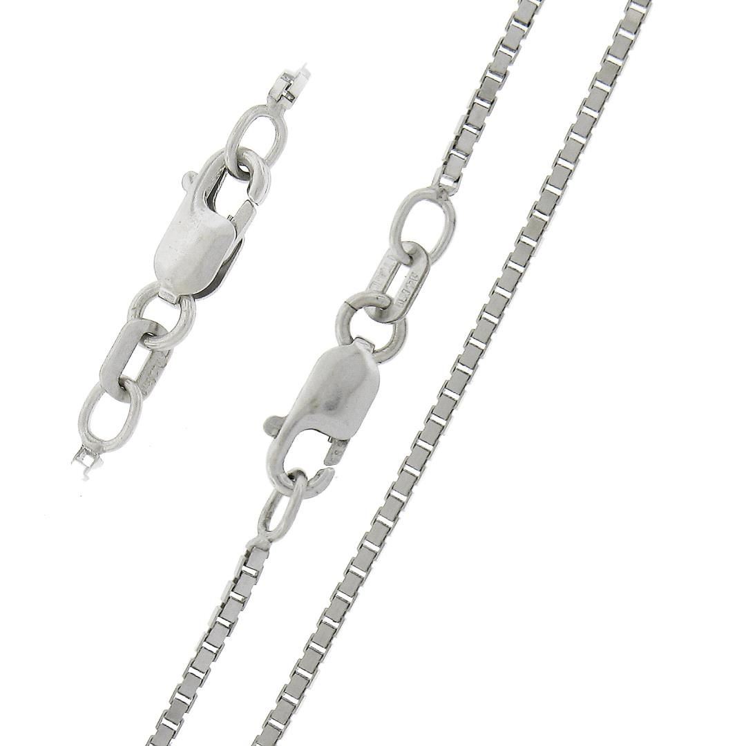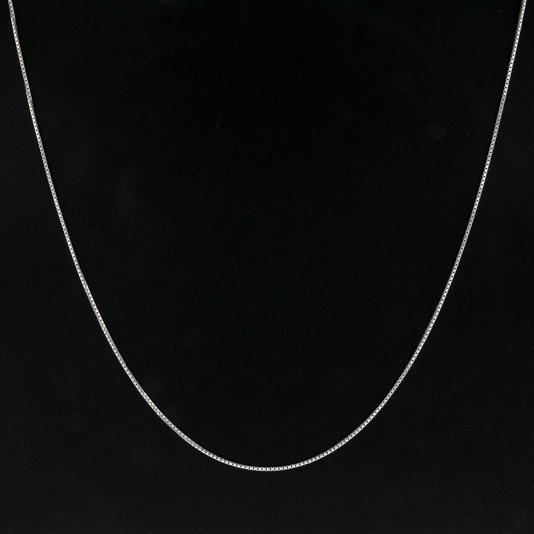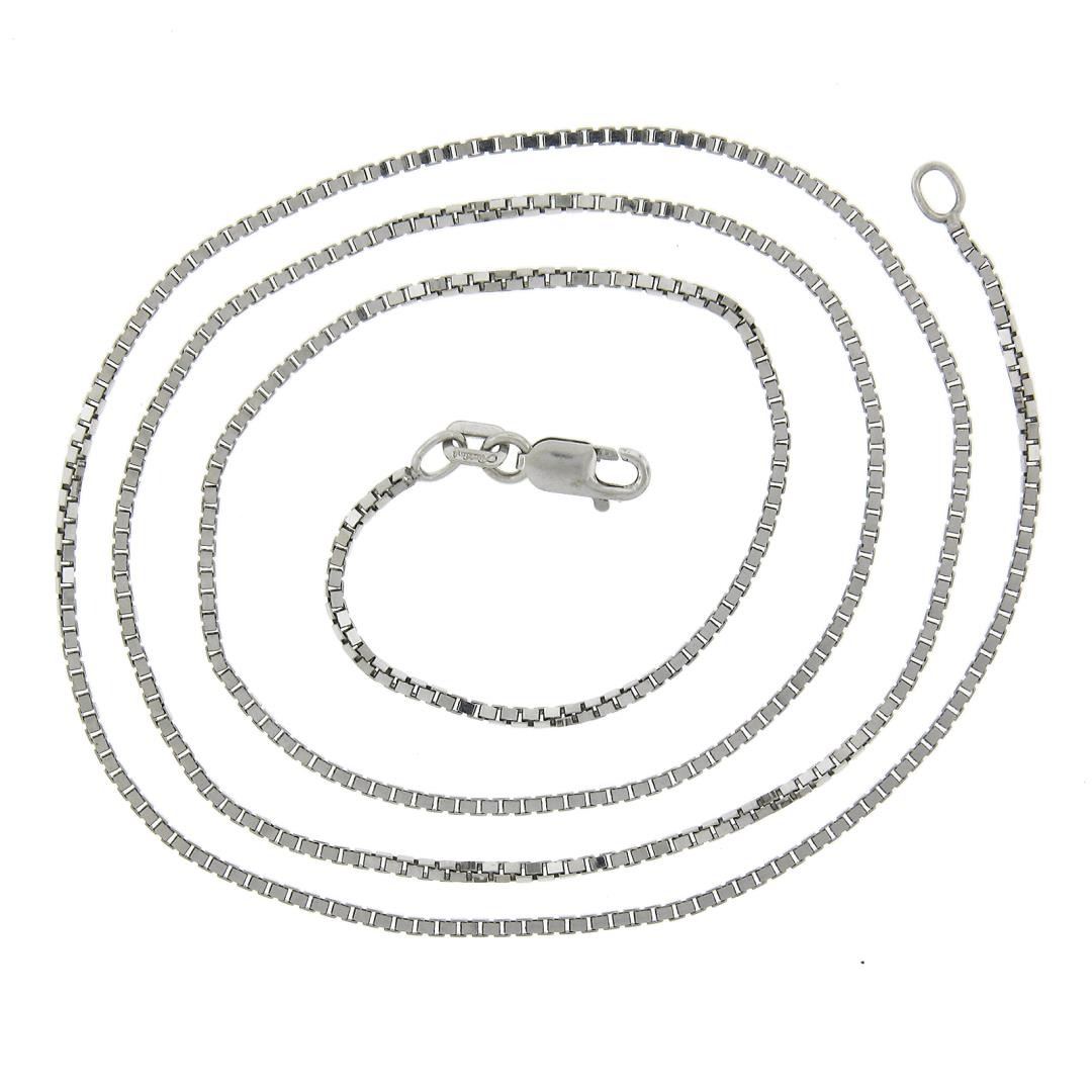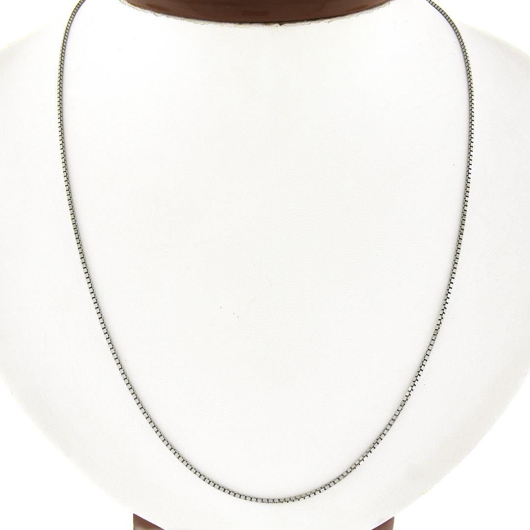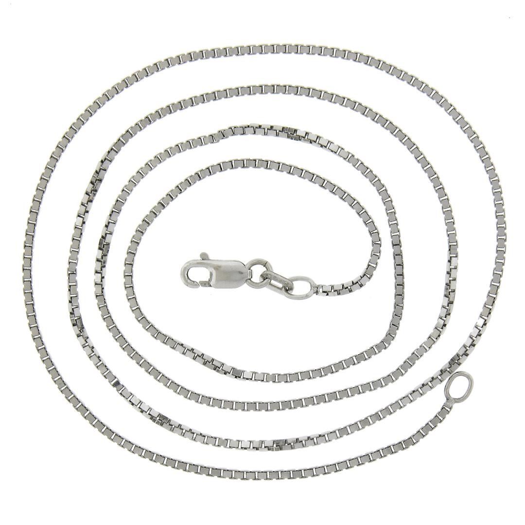 A solid 14k white gold box link chain necklace. It weighs a total of 4.76 grams, measures 1.3mm wide, and measures 20 inches in length.