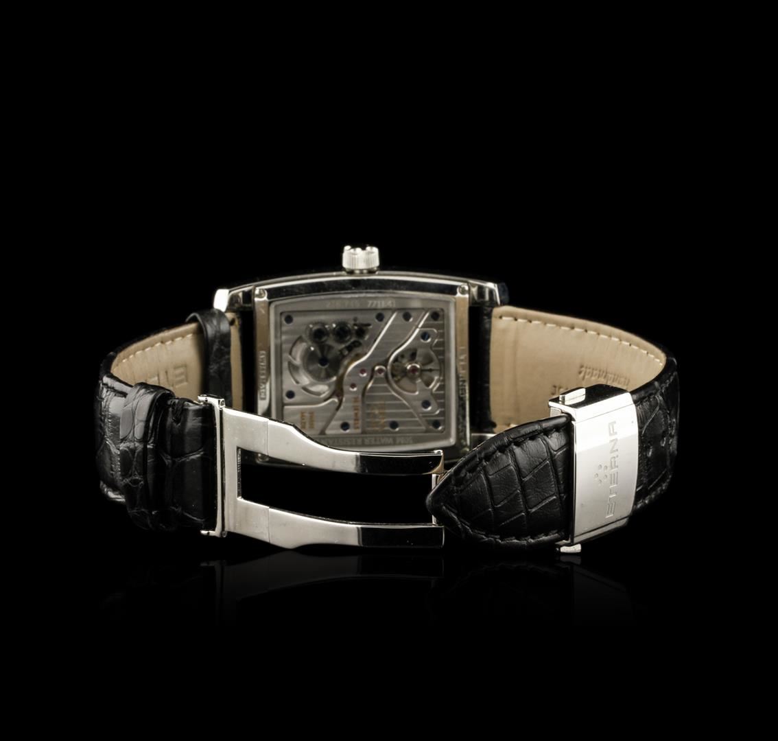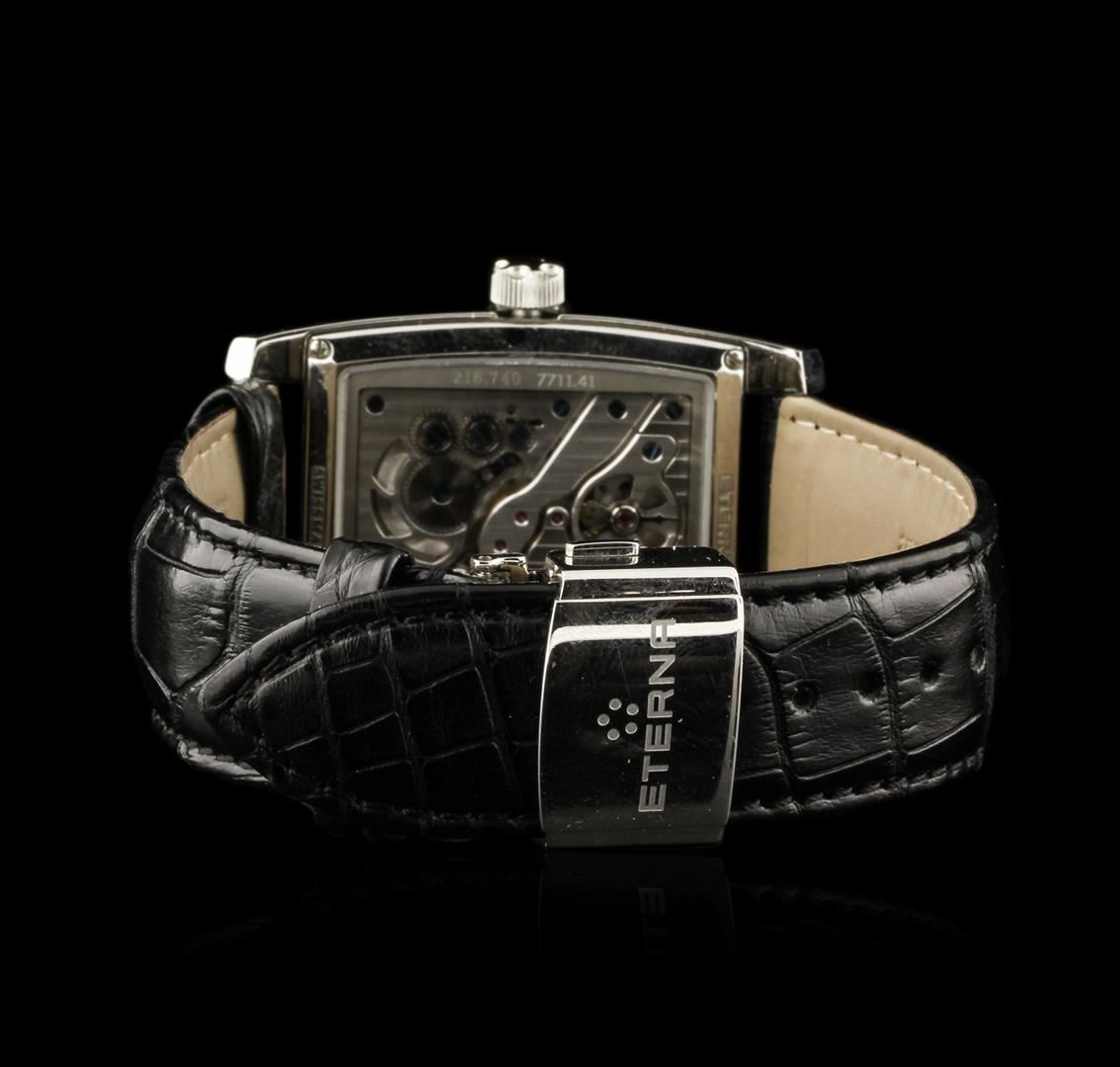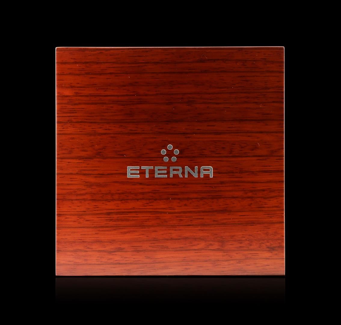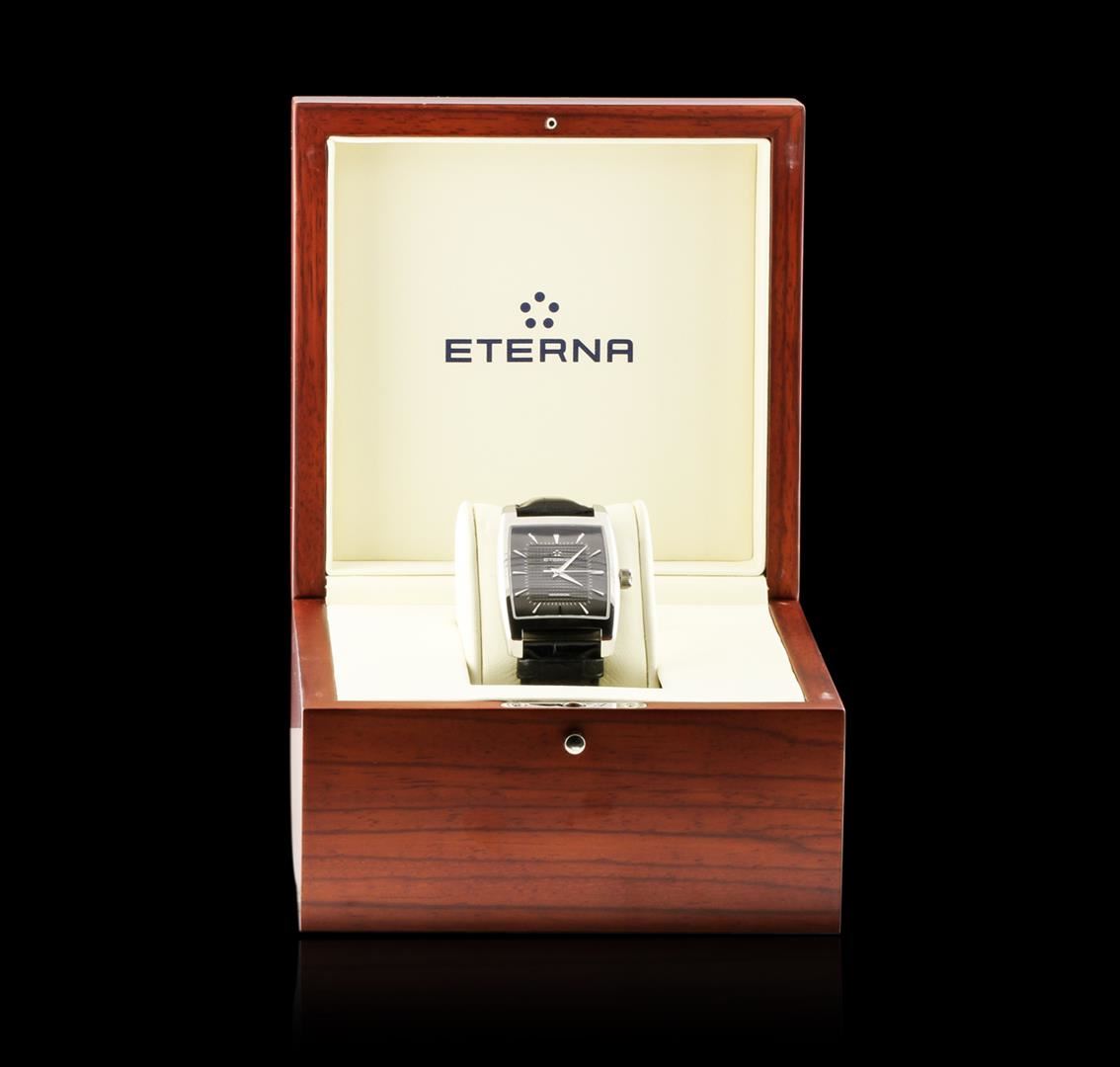 One Eterna Madison wristwatch featuring: 18 jewels hand-wound movement. Case: Stainless steel. Bracelet: Black alligator leather strap with folding clasp. Dial: Black with slate grey dial hour and minute markers. Crown: Push-down. Scratch resistant sapphire crystal. Water resistant to 50 meters.