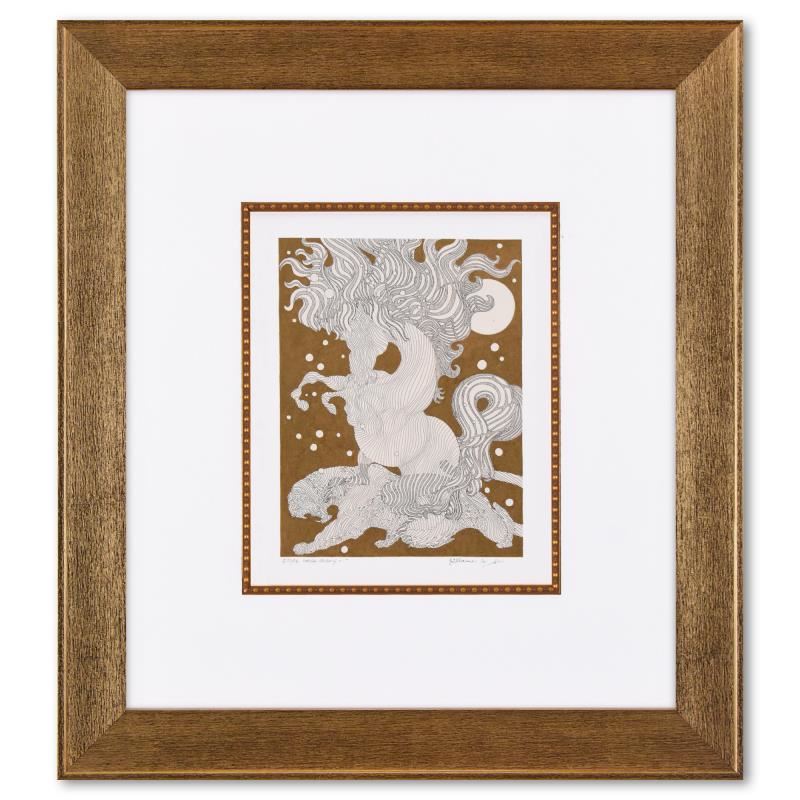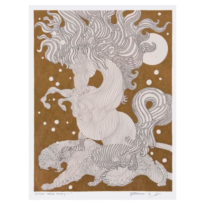"Etude GHKK" is an original hand colored drawing on paper with hand laid gold leaf by Guillaume Azoulay, hand signed by the artist. This piece comes custom framed. Includes Letter of Authenticity. Measures approx. 23" x 25.5" (frame); 8" x 11" (image).