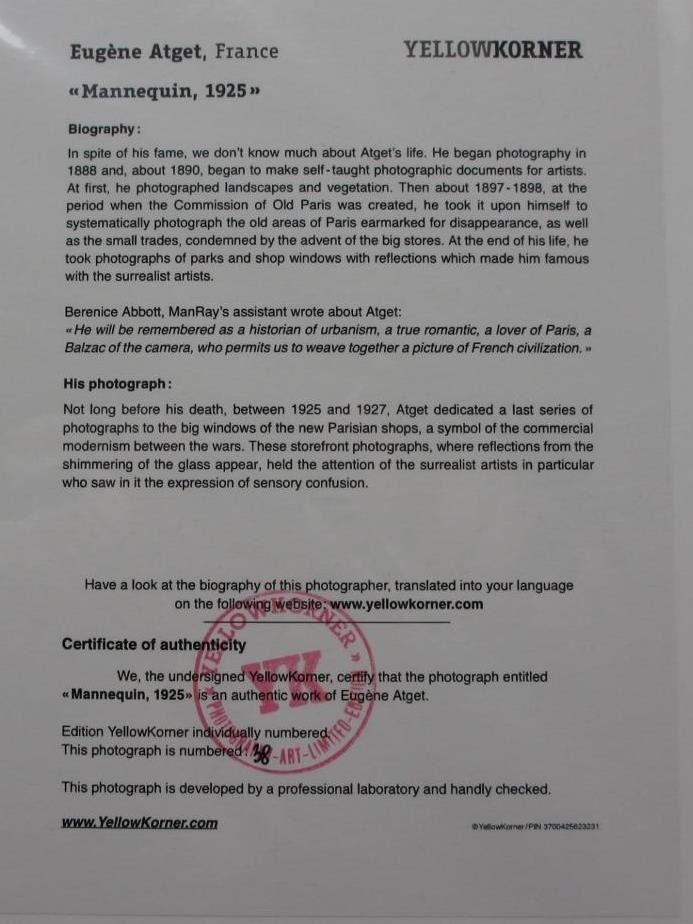 Mannequin Certified Photograph, Eugene Atget YellowKorner Certified Photograph. Certificate of Authenticity from YellowKorner affixed to the back. Matted Dimensions 16"x20". Protected with Clear Mylar Sleeve.