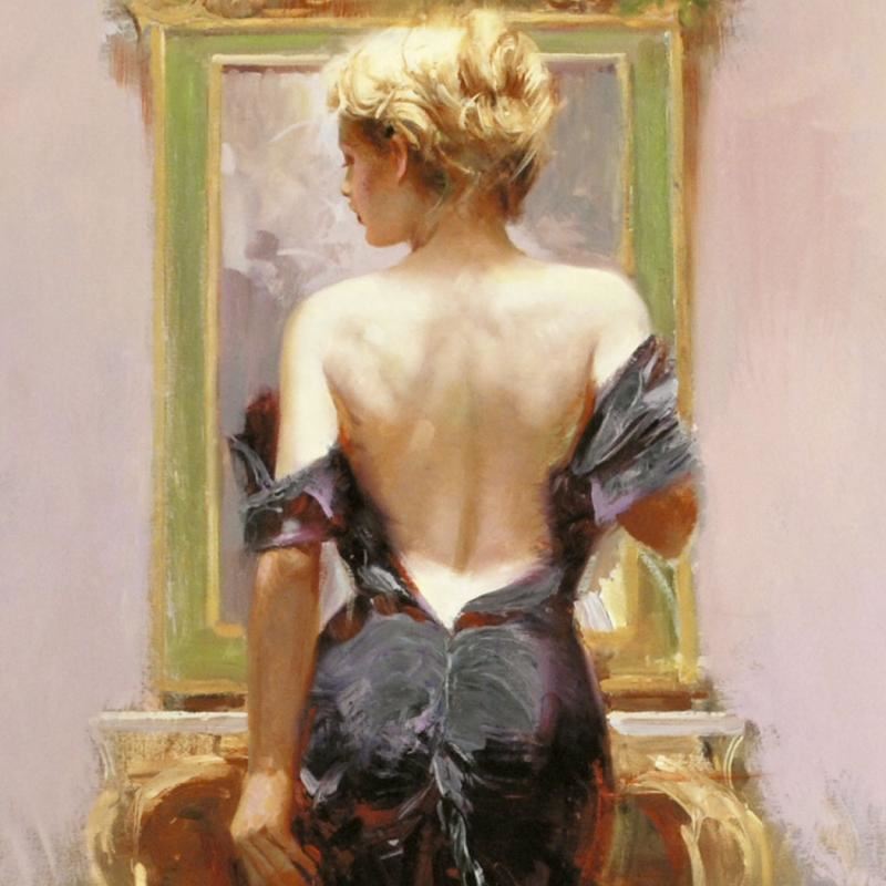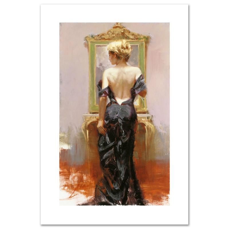 Pino's portraits allow glimpses into intensely personal, intimate spaces, conveying emotion through rich, warm color and sensual brushwork. "Evening Elegance" is a limited edition giclee on canvas that has been hand-embellished by Pino himself, AP numbered and hand signed by Pino (1939-2010). Includes Certificate of Authenticity! Measures approx. 12" x 20" (image).