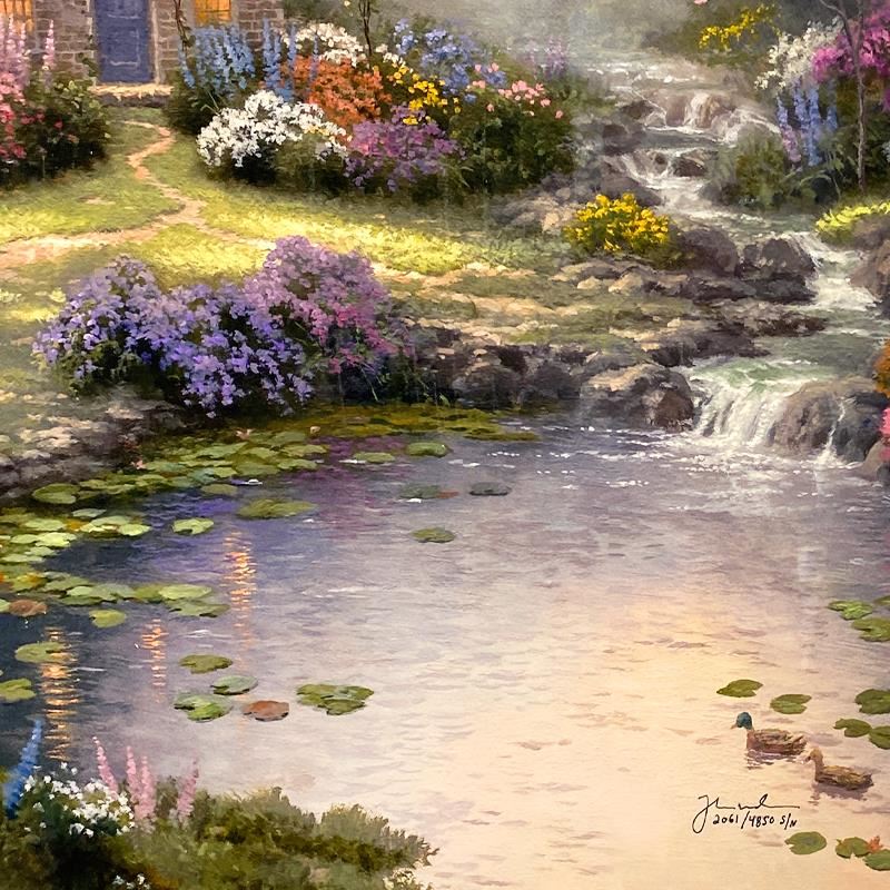 "Everett's Cottage" is a limited edition offset lithograph on paper by Thomas Kinkade (1958-2012), numbered and bearing Kinkade's authorized signature. This piece is framed. Measures approx. 30.5" x 36.5" (frame), 23.5" x 29.5" (image). There is some minor wear on the frame.