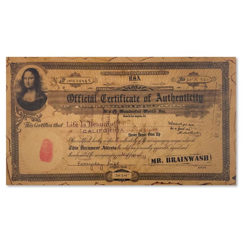 "Everyday Life" is a unique (UNIQ) mixed media on deckle edge paper by Mr. Brainwash, hand signed and bearing the thumbprint of the artist inverso. This piece comes custom framed. Includes Certificate of Authenticity. Measures approx. 34" x 26" (frame), 30" x 22" (image).