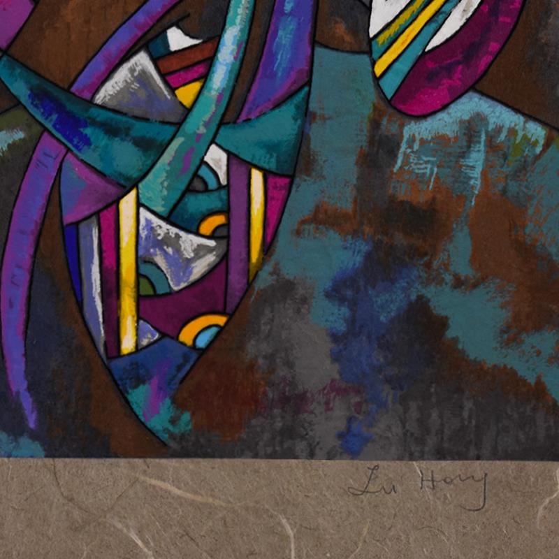 "Eyes of the Jungle" is a limited edition serigraph on rice paper by Lu Hong, numbered and hand signed by the artist. Includes Letter of Authenticity. Measures approx. 37" x 38" (with border), 33" x 32" (image).