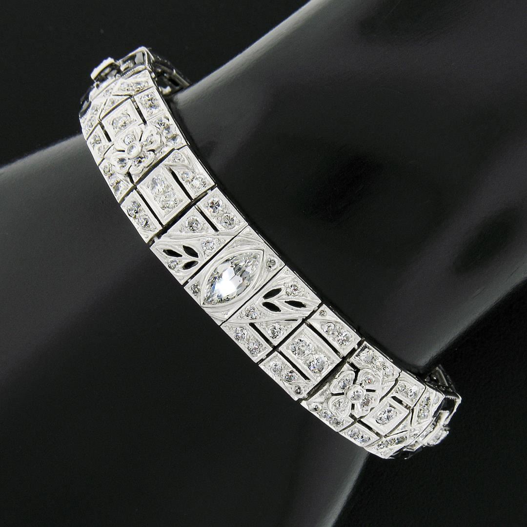 An antique solid platinum line bracelet, with 1 old marquise cut natural diamond (H/I Color - SI1 Clarity - 0.58ctw), 182 old european & old single cut natural diamonds (G/I - VS1/SI2 ; 5.45ctw), and 24 french baguette cut natrual black onyx. It weighs a total of 35.30 grams, measures 10.9mm wide, and measures 6.75 inches in length.