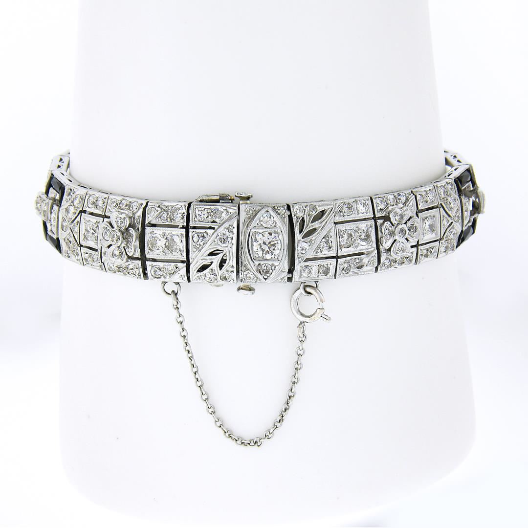 An antique solid platinum line bracelet, with 1 old marquise cut natural diamond (H/I Color - SI1 Clarity - 0.58ctw), 182 old european & old single cut natural diamonds (G/I - VS1/SI2 ; 5.45ctw), and 24 french baguette cut natrual black onyx. It weighs a total of 35.30 grams, measures 10.9mm wide, and measures 6.75 inches in length.