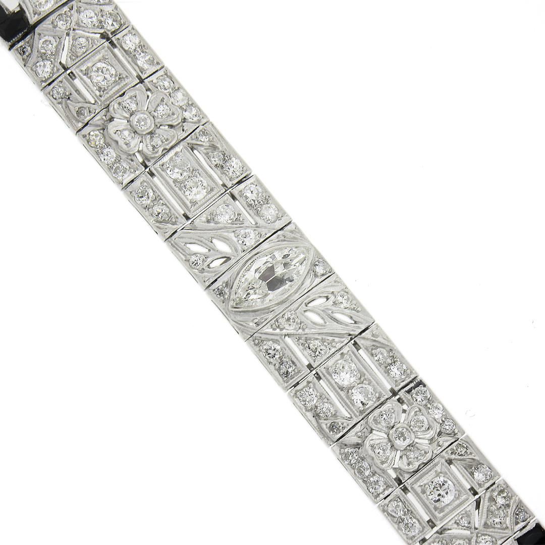 An antique solid platinum line bracelet, with 1 old marquise cut natural diamond (H/I Color - SI1 Clarity - 0.58ctw), 182 old european & old single cut natural diamonds (G/I - VS1/SI2 ; 5.45ctw), and 24 french baguette cut natrual black onyx. It weighs a total of 35.30 grams, measures 10.9mm wide, and measures 6.75 inches in length.