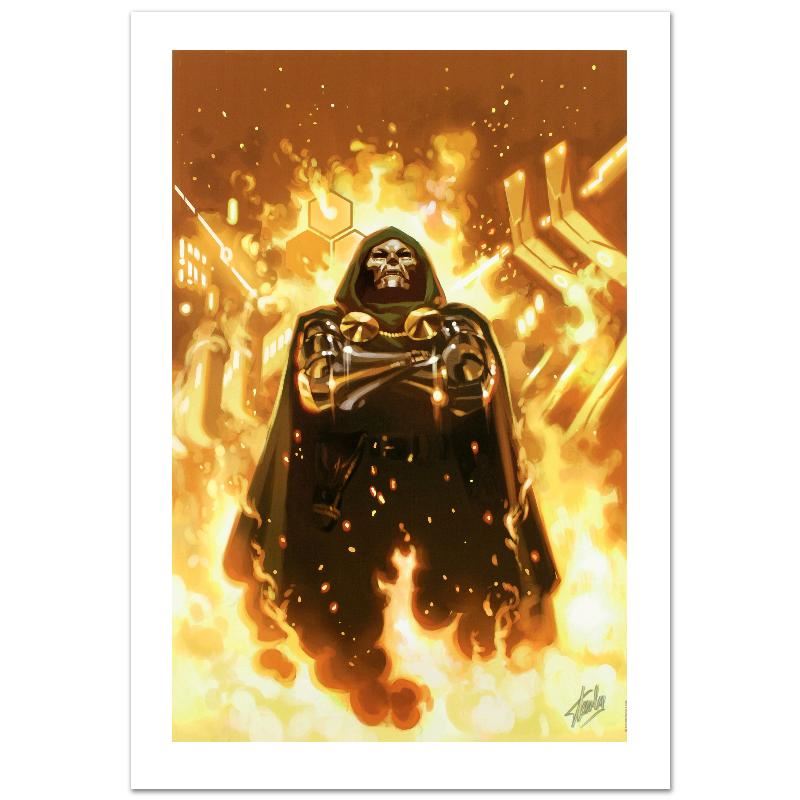 A piece of comic book history, this limited edition, from original art by Daniel Acuna, depicts a Mencaing Dr. Doom. Spanish artist Daniel Acuna cites artists like Jack Kirby and Simon Bisley as his early artist influences. After doing some occasional cover art for Marvel, Acuna signed an exclusive contract with Marvel in 2007. "FF # 2" is a limited edition giclee on canvas by Daniel Acuna presented by Marvel Comics, numbered and hand signed by the great Stan Lee! Includes Certificate of Authenticity! Measures approx. 18" x 27" (image).