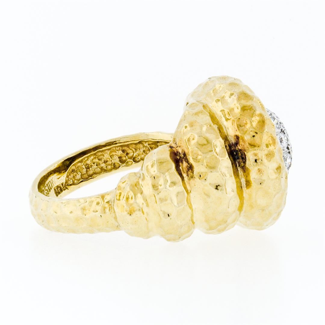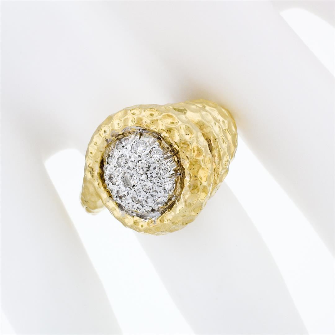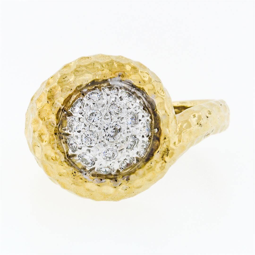 An estate solid 18k yellow & white gold cocktail ring by R. Stone, with 19 round brilliant cut natural diamonds (E/F - VS1/VS2 ; 0.45ctw). The ring is size 6.5, weighs a total of 12.80 grams, and measures 17mm wide.