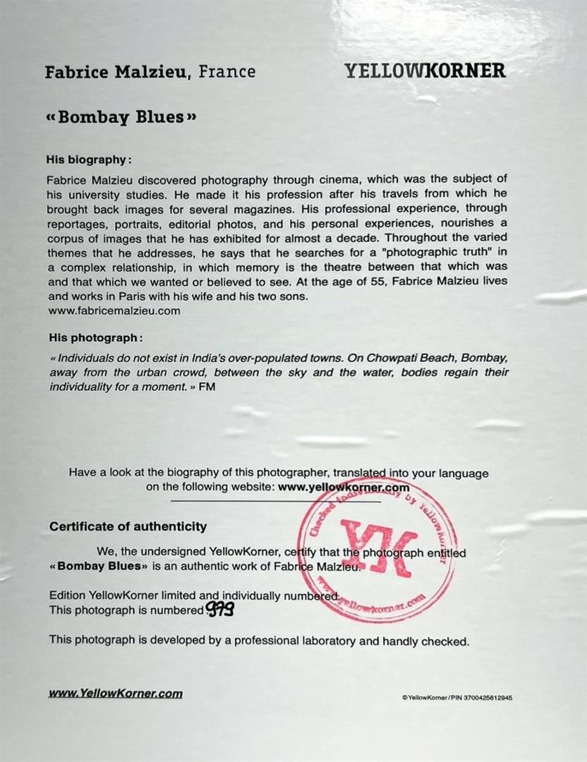 Fabrice Malzieu France Bombay Blues YellowKorner Certified Photograph. Certificate of Authenticity from YellowKorner affixed to the back. Matted Dimensions 16"x20". Protected with Clear Mylar Sleeve.