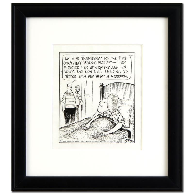 Enter a surreal and satirical world of twisted imagination and award winning creativity. "Facelift" is an original pen & ink drawing on paper by Dan Piraro, creator of the critically acclaimed and award winning comic strip, Bizarro! This piece is hand signed and comes framed. Includes Certificate of Authenticity! Measures approx. 13" x 14" (frame), 6" x 7" (image).