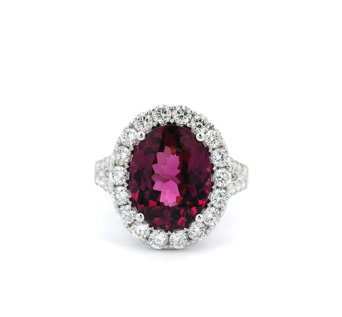 A 14KT white gold oval halo ring with a 5.12ct natural pink tourmaline of strong purplish-red color. Accented by 1.03ct total weight of round brilliant cut diamonds, graded VS-2 to SI-1 clarity. The ring has a 2mm shank with a cathedral basket motif.