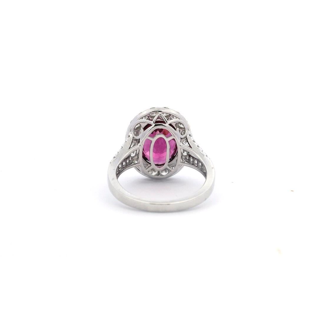 A 14KT white gold oval halo ring with a 5.12ct natural pink tourmaline of strong purplish-red color. Accented by 1.03ct total weight of round brilliant cut diamonds, graded VS-2 to SI-1 clarity. The ring has a 2mm shank with a cathedral basket motif.
