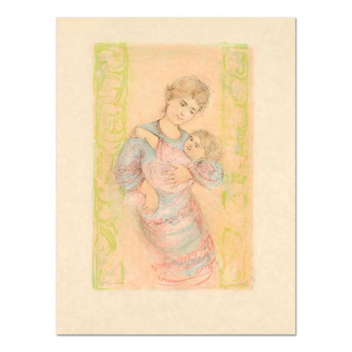 "Fair Alice and Baby" is a limited edition lithograph on rice paper by Edna Hibel (1917-2014), numbered and hand signed by the artist. Includes Certificate of Authenticity. Measures approx. 20" x 26" (border), 13" x 20" (image).
