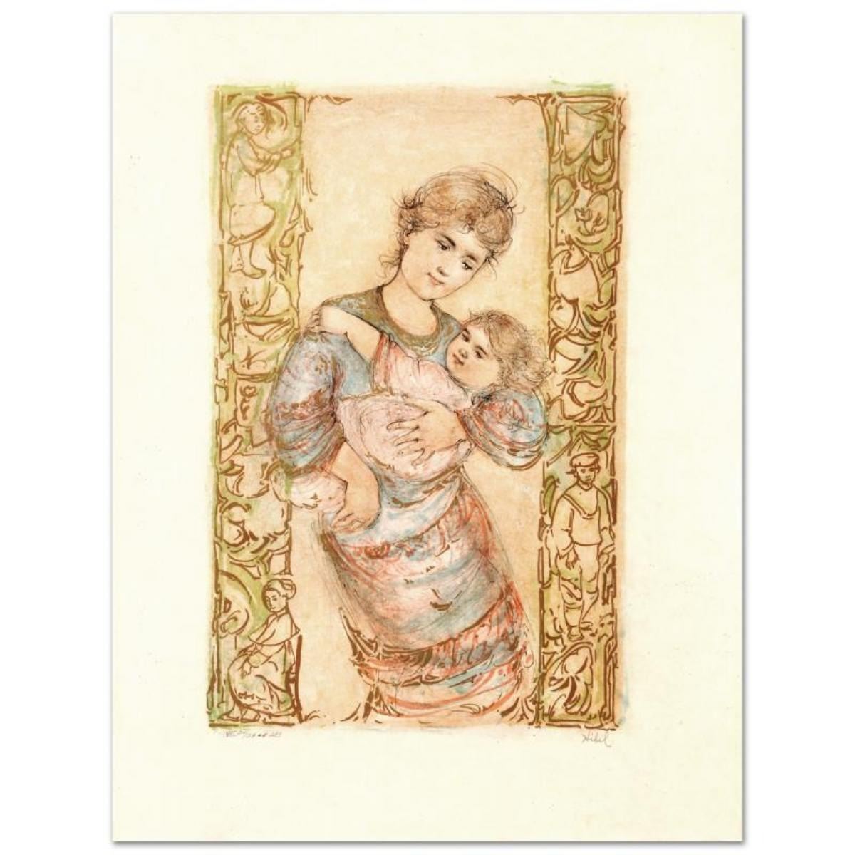 "Fair Alice and Baby" is a limited edition lithograph on rice paper, numbered and hand signed by Edna Hibel (1917-2014). Includes Certificate of Authenticity! Measures approx. 20" x 26.5" (with border), 13" x 21" (image).