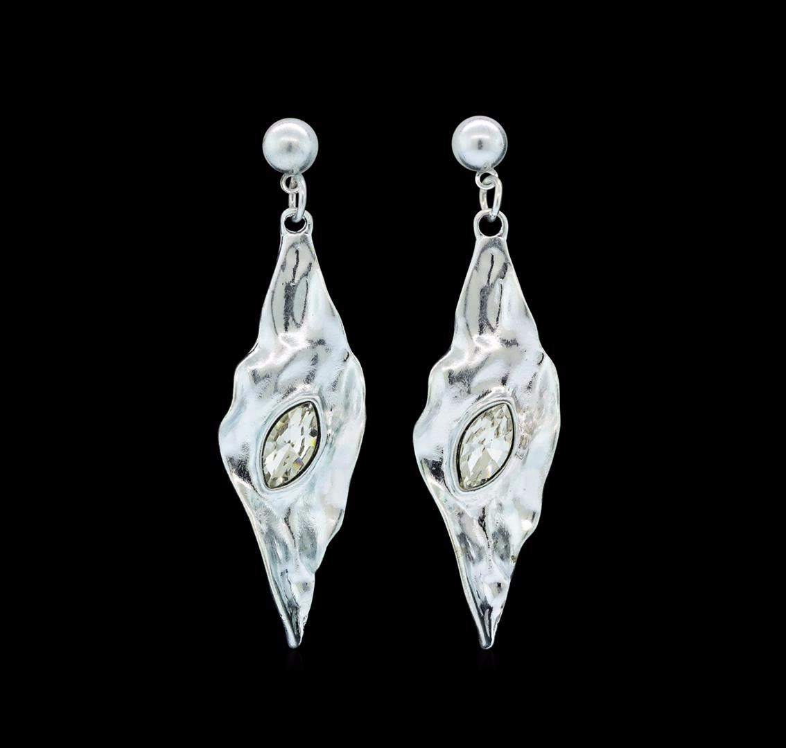 High end designer jewelry. Fall Leaf Crystal Earrings - Rhodium Plated. Rhodium Plated Metal/2.25" Dangle. Silver/ Clear. Post. Total Weight: 7.8 grams.