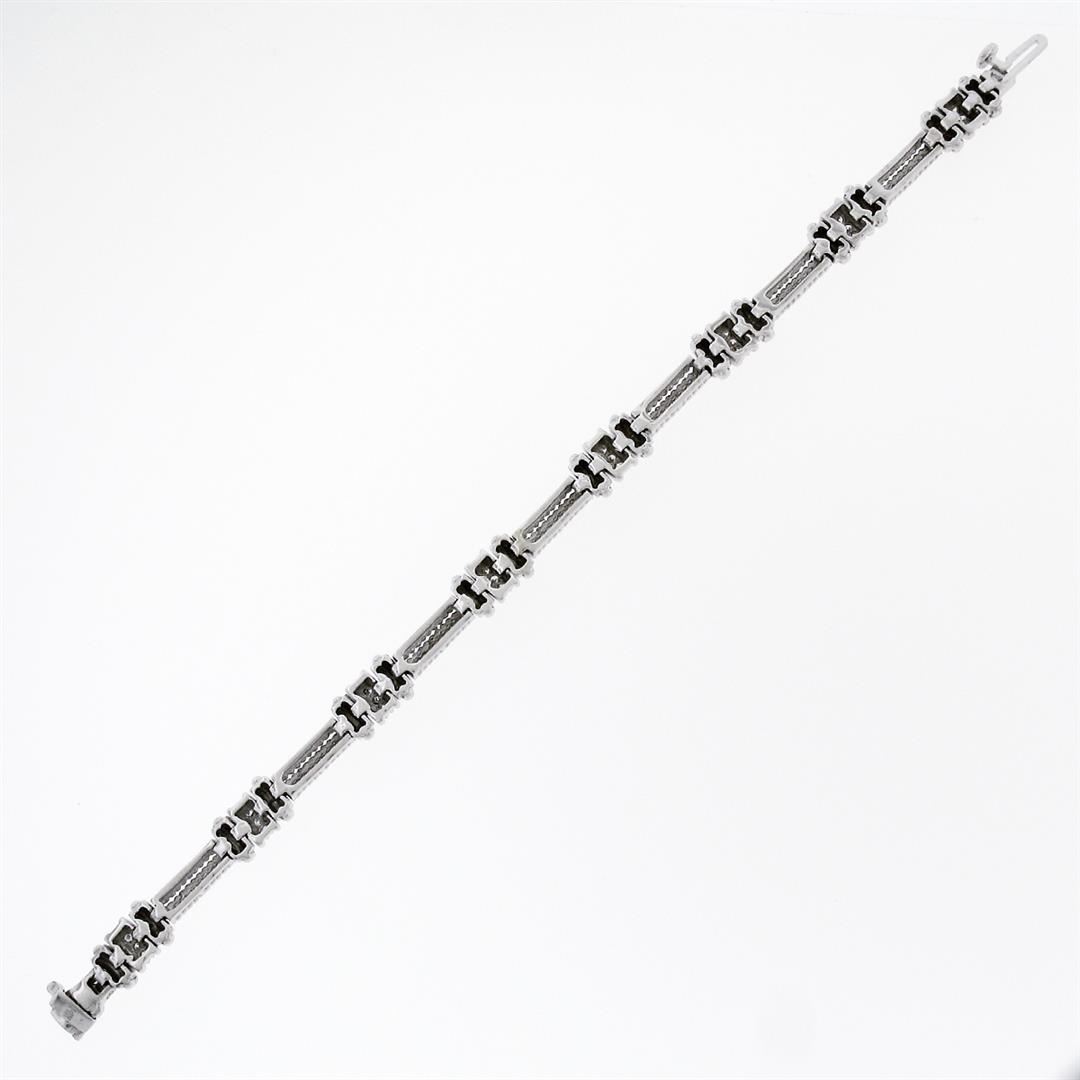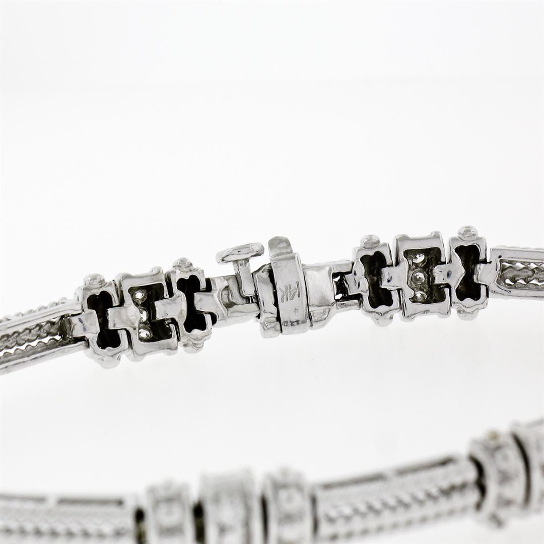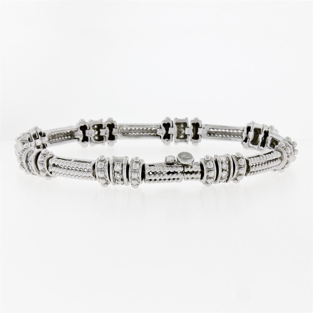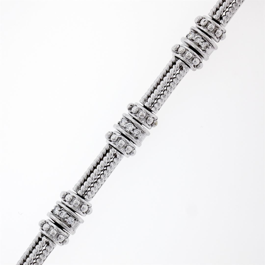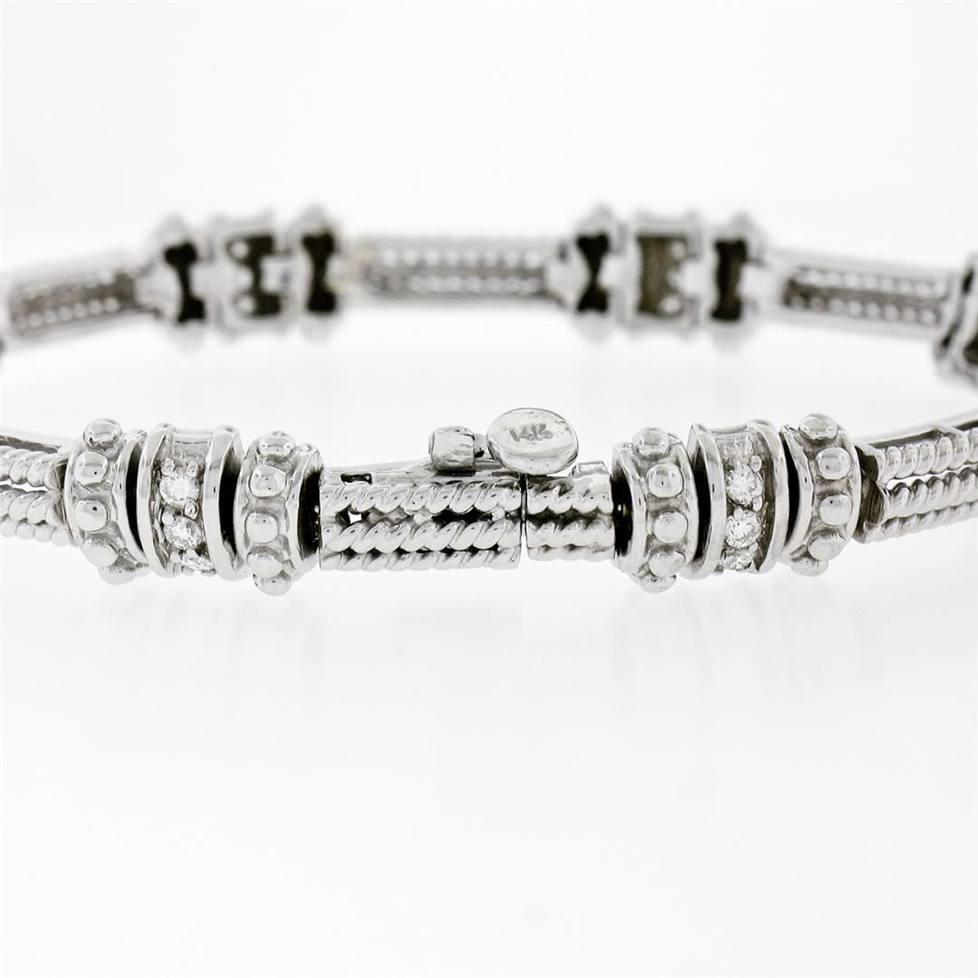 An estate solid 14k white gold twisted wire link bracelet, with 24 round brilliant cur natural diamonds (F/G - VVS2/VS1; 0.72ctw). It weighs a total of 21.86 grams, measures 7.55mm wide, and measures 7 inches in length.