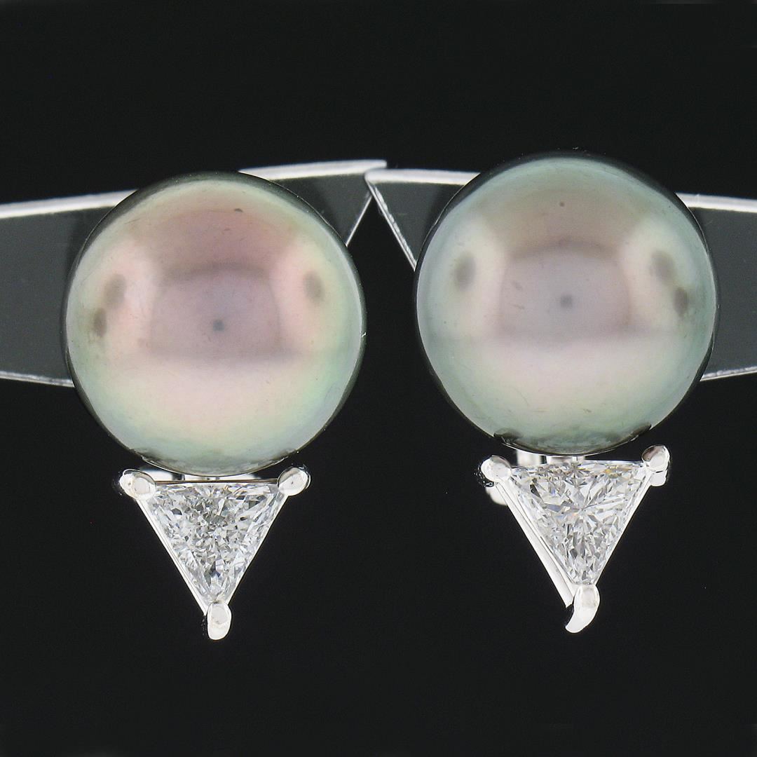 A solid 14k white gold earrings, with 2 round shape cultured Tahitian pearls (11.60mm each), and 2 trillion cut natural diamonds (E/F - VS1/VS2 ; 0.80ctw). The earrings measure approximately 17.8x11.6mm and weigh a total of 7.91 grams.