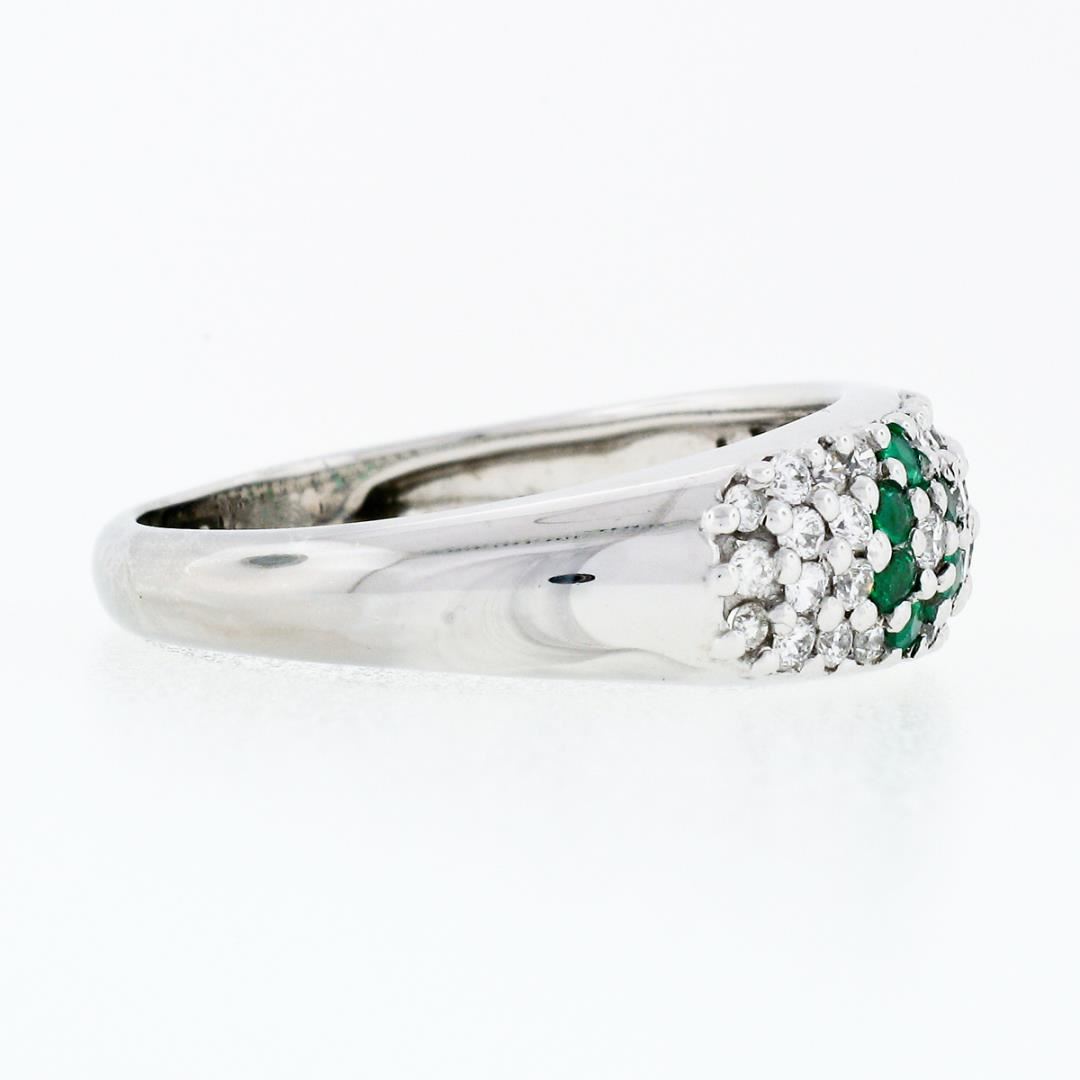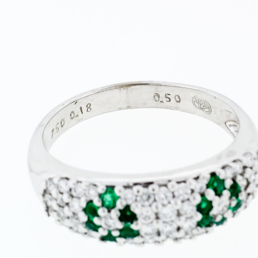 A solid 18k white gold floral band ring, with 12 round cut natural emeralds (0.18ctw), and 44 round cut natural diamonds (F/G - VS1/VS2 ; 0.50ctw). The ring is size 8.75, weighs a total of 4.6 grams, and measures 6.8mm wide.