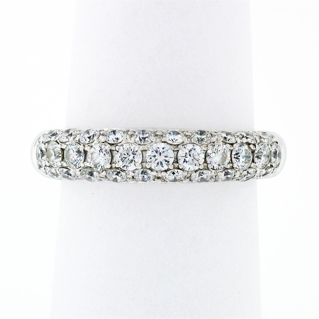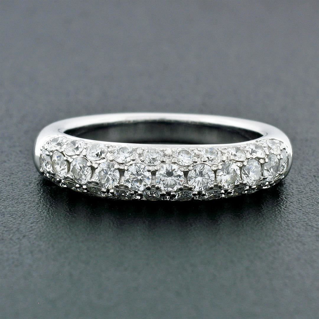 An estate solid 18k white gold band ring, with 31 round brilliant cut natural diamonds ( F/G- VS2/SI1; 1.15ctw). The ring is size 6.5, weighs a total of 5.25 grams, and measures 4.75mm wide.