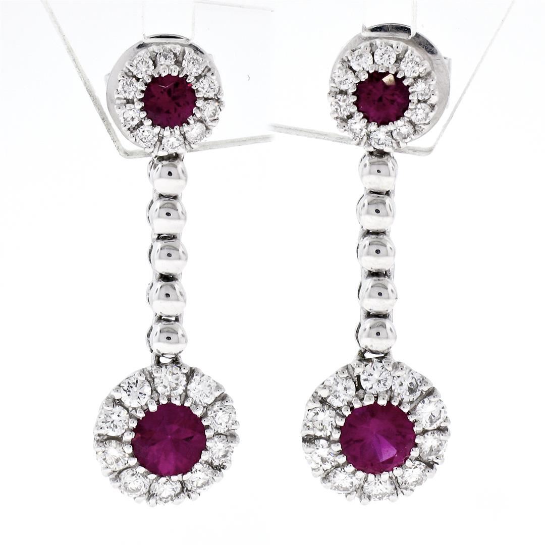 A new solid 18k white gold fancy drop dangle earrings, featuring 4 round brilliant cut natural rubies (82ctw ), and 40 round brilliant cut natural diamonds (F/G- VS2; 0.56ctw). The earrings measure approximately 24.80x8.0mm and weigh a total of 4.95 grams.