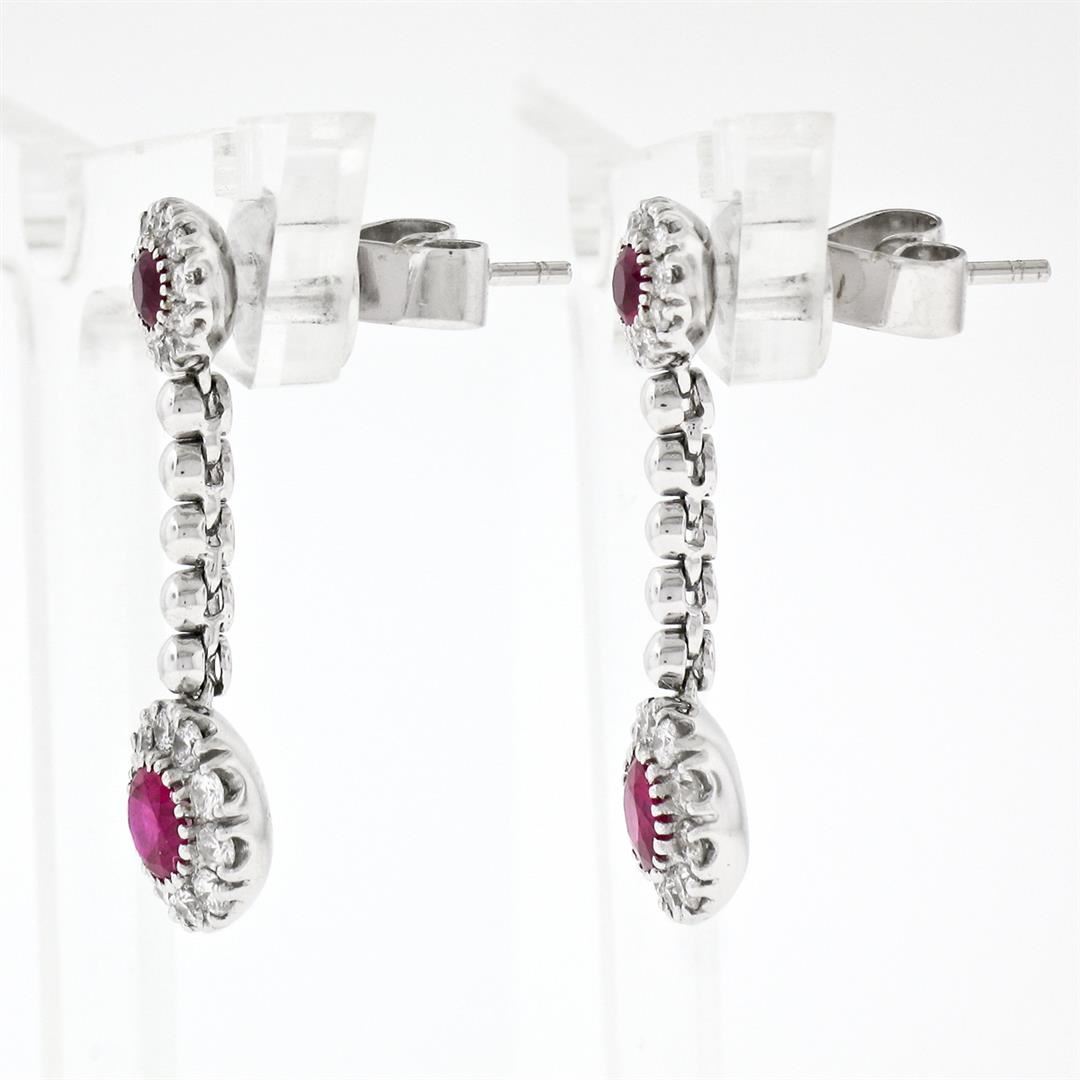 A new solid 18k white gold fancy drop dangle earrings, featuring 4 round brilliant cut natural rubies (82ctw ), and 40 round brilliant cut natural diamonds (F/G- VS2; 0.56ctw). The earrings measure approximately 24.80x8.0mm and weigh a total of 4.95 grams.