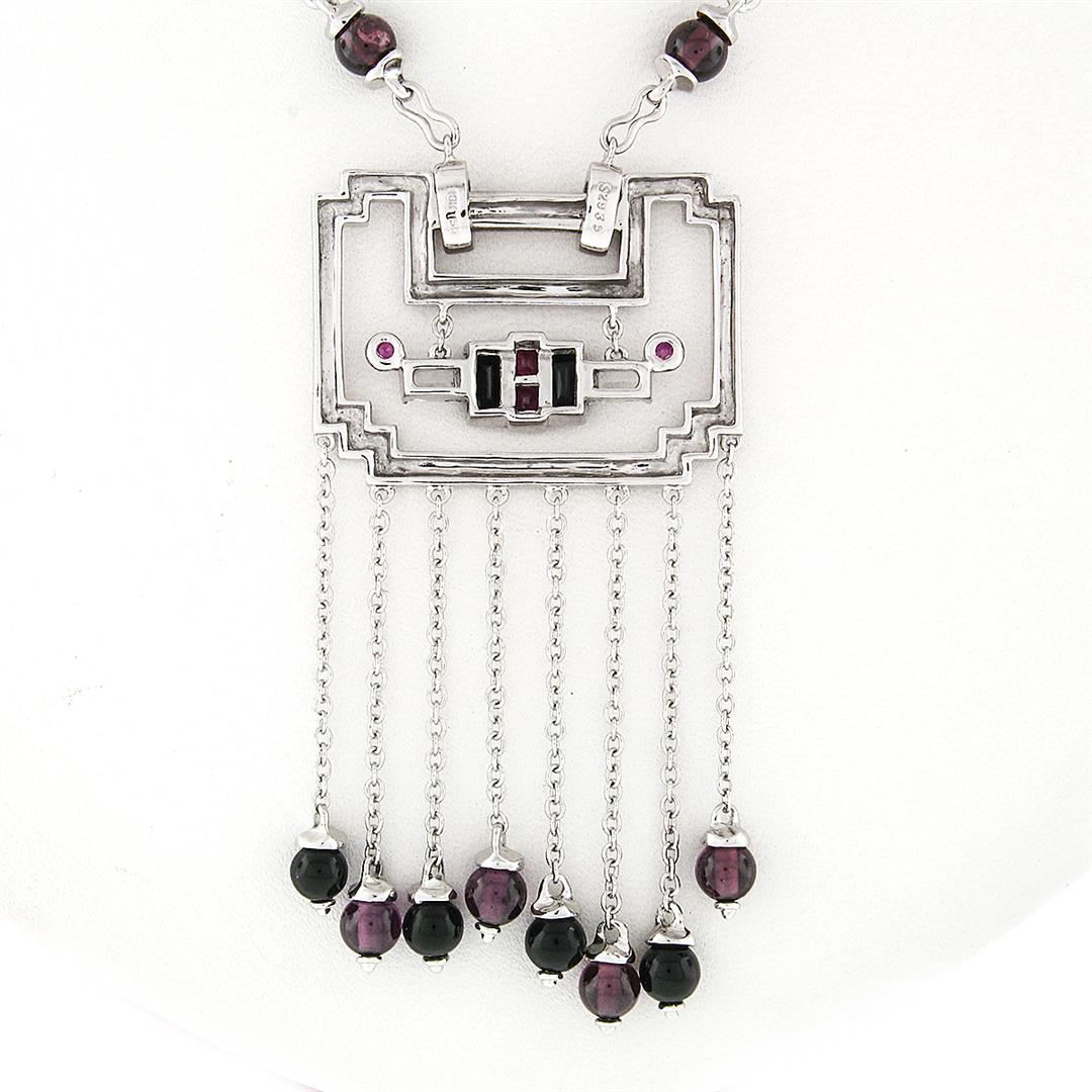 A solid 18k white gold tassel chandelier pendant necklace, with cylinder shape natural black onyx (8.8mm long x 3.8mm diameter), and 4 round bead cut natural black onyx (4.5mm), and 2 rectangular buff top cut natural black onyx (4.7x3mm), and 18 round bead cut natural rubellite tourmaline (4.5mm), and 2 square buff top cut natural ruby (2.7mm ), and 2 round brilliant cut natural ruby (), with 2 French baguette cut natural sapphires (3.9x2.7mm). 20 inch fancy link chain, 33.78 grams total weight, pendant measures 62.8x31.9mm.
