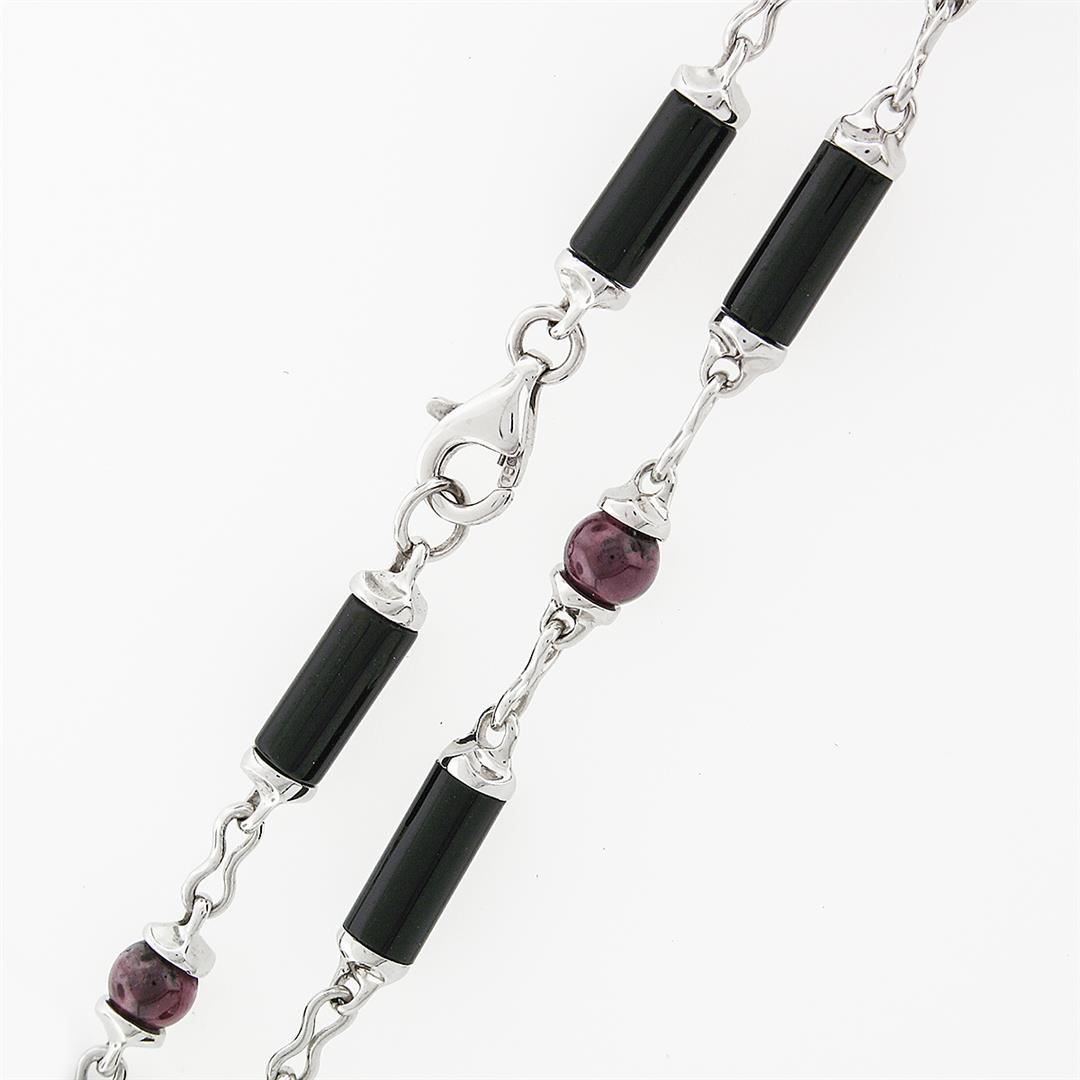 A solid 18k white gold tassel chandelier pendant necklace, with cylinder shape natural black onyx (8.8mm long x 3.8mm diameter), and 4 round bead cut natural black onyx (4.5mm), and 2 rectangular buff top cut natural black onyx (4.7x3mm), and 18 round bead cut natural rubellite tourmaline (4.5mm), and 2 square buff top cut natural ruby (2.7mm ), and 2 round brilliant cut natural ruby (), with 2 French baguette cut natural sapphires (3.9x2.7mm). 20 inch fancy link chain, 33.78 grams total weight, pendant measures 62.8x31.9mm.