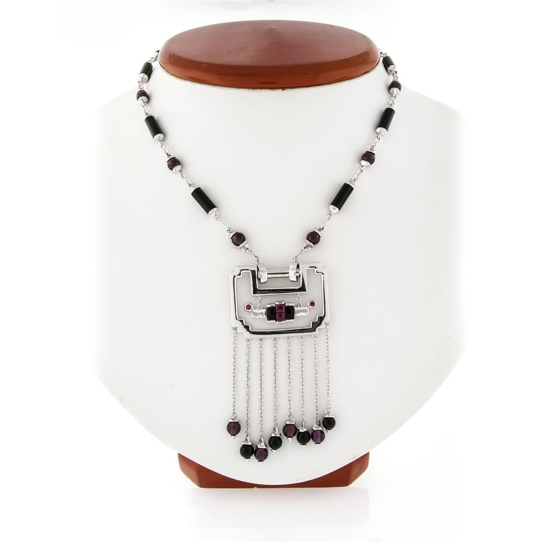A solid 18k white gold tassel chandelier pendant necklace, with cylinder shape natural black onyx (8.8mm long x 3.8mm diameter), and 4 round bead cut natural black onyx (4.5mm), and 2 rectangular buff top cut natural black onyx (4.7x3mm), and 18 round bead cut natural rubellite tourmaline (4.5mm), and 2 square buff top cut natural ruby (2.7mm ), and 2 round brilliant cut natural ruby (), with 2 French baguette cut natural sapphires (3.9x2.7mm). 20 inch fancy link chain, 33.78 grams total weight, pendant measures 62.8x31.9mm.
